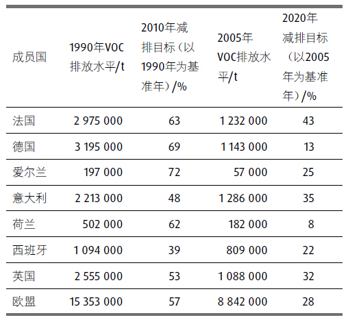在歐盟內部,哥德堡協議關于特定大氣污染物的國家排放上限的要求是在《指令2001/81/EC》(即NEC指令)中執行的。和哥德堡協議一樣,該指令意在限制酸化和富養分污染物以及臭氧前 驅體的排放量,從而改善歐盟環境和人體健康,降低土壤酸化、 富營養化和地面臭氧風險。最初,2010年的目標是按照哥德堡協 議的要求執行的。自2013年以來,歐盟委員會一直致力于對該指 令進行修訂,主要是將哥德堡協議2020年的目標納入指令。作為 新要素,歐盟委員會也正在計劃2020年以后進一步的減排目標。 2013年底的官方修訂草案包括了2020年的目標及2030年的目標。 通過上述措施,歐盟委員會希望大大降低空氣污染,并進一步接 近歐盟清潔和健康空氣的長期目標。該草案規定德國2030年的目 標為排放652 000 t,即與2005年相比,明顯減少43%。在5年或10 年時間內是很難實現這一目標。涂料和印刷油墨行業也會因此受 到影響。比如,德國聯邦環境署(UBA)對印刷行業的NMVOC減 排潛力研究項目就體現了這一點。