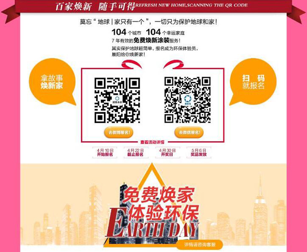 為響應(yīng)綠色地球日的環(huán)保主題,4月10日起,晨陽水漆全面開啟“百城百家”活動,將聯(lián)合全國104個重點城市選出104個幸運家庭。晨陽水漆將發(fā)動經(jīng)銷商、新老客戶及社會各界人士一起,打響本年度家裝服務(wù)的關(guān)鍵一槍!