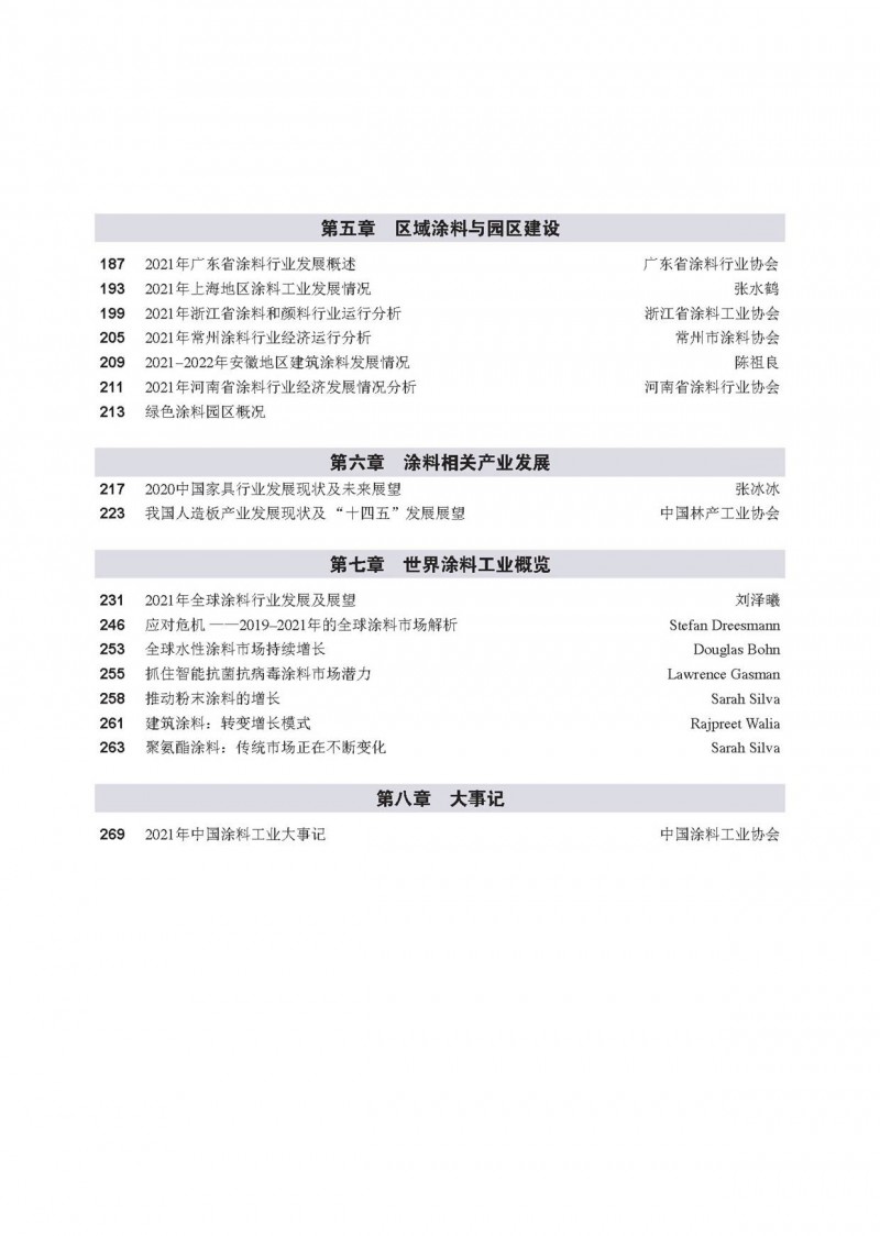 《中國(guó)涂料工業(yè)年鑒2021》共分7個(gè)章節(jié),總結(jié)了2021年中國(guó)涂料工業(yè)經(jīng)濟(jì)運(yùn)行現(xiàn)狀,收錄了2021年度與涂料和顏料行業(yè)相關(guān)的政策法規(guī)及標(biāo)準(zhǔn),闡述了我國(guó)涂料細(xì)分領(lǐng)域2021年度經(jīng)濟(jì)運(yùn)行、市場(chǎng)狀況、技術(shù)新進(jìn)展及未來(lái)發(fā)展,整理了國(guó)內(nèi)主要地區(qū)的涂料工業(yè)運(yùn)行及園區(qū)建設(shè)現(xiàn)狀,以及全球不同涂料領(lǐng)域市場(chǎng)發(fā)展?fàn)顩r,總結(jié)了我國(guó)主要涂料用原材料工業(yè)的新進(jìn)展和市場(chǎng)走勢(shì),記錄了2021年我國(guó)涂料行業(yè)經(jīng)歷的重要事件等。