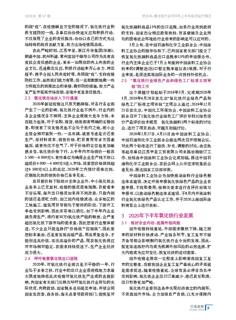 綜述了在新冠肺炎疫情影響下,中國氧化鐵行業2020年上半年的經濟指標和出口預計完成狀況,預測了行業2020年下半年未來走勢,并著重對疫情對行業經濟運行的影響進行了分析。