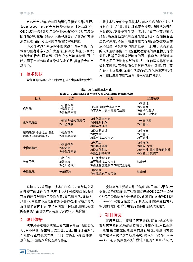 針對汽車4S店的小型噴漆車間存在廢氣與顆粒污染物并存且廢氣濃度低、波動大、風量小、擬投資額少的特點,研究出一種組合廢氣治理裝置。通過將不同技術進行對比,簡要介紹了該技術的研究現狀,并深入闡述了裝置的設計依據、工藝及工作原理、結構設計及工程應用情況。