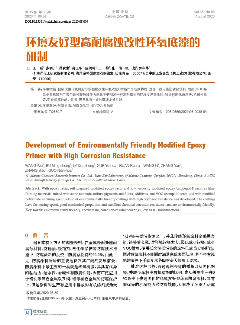 本文系作者@汪 威,步明升,呂秋生,薛玉華,阮潤琦,王 黎,張 巖,張 彪,郭年華 授權中國涂料網發表,并經中國涂料網編輯,未經允許不得轉載,如需轉載請聯系chinacoatingnet@vip.163.com