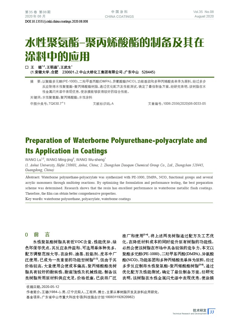 水性聚氨酯-聚丙烯酸酯的制備及其在涂料中的應用