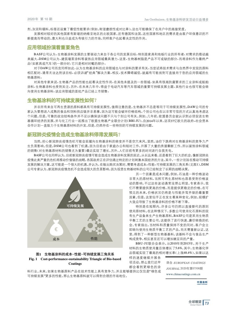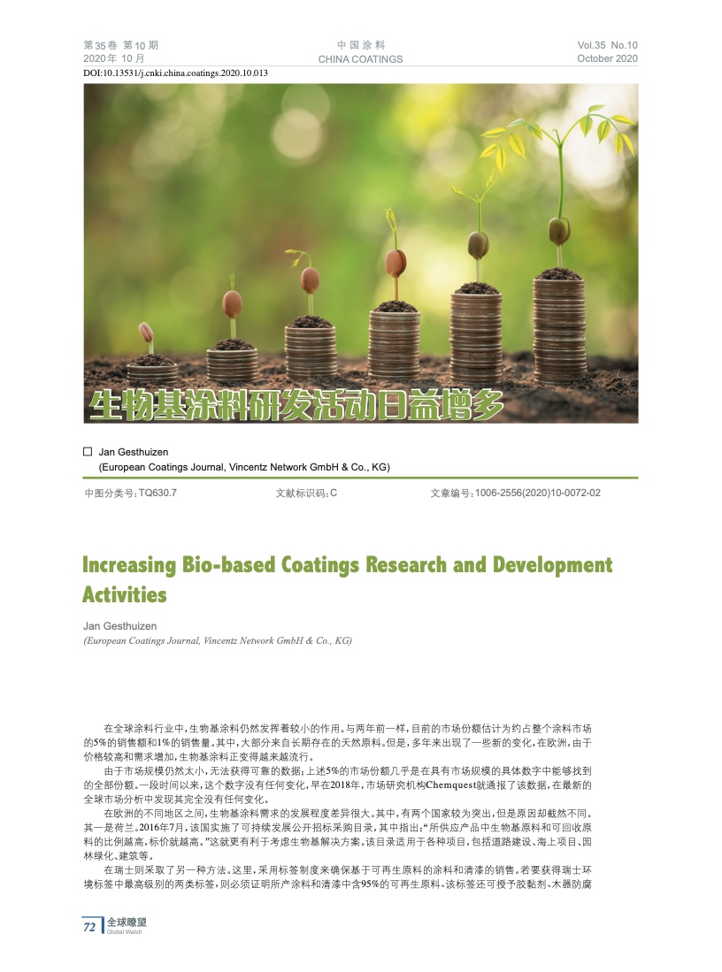 摘要:編者按:在全球涂料行業(yè)中,生物基涂料仍然發(fā)揮著較小的作用。與兩年前一樣,目前的市場(chǎng)份額估計(jì)為約占整個(gè)涂料市場(chǎng)的5%的銷(xiāo)售額和1%的銷(xiāo)售量。其中,大部分來(lái)自長(zhǎng)期存在的天然原料。但是,多年來(lái)出現(xiàn)了一些新的變化,在歐洲,由于價(jià)格較高和需求增加,生物基涂料正變得越來(lái)越流行。
