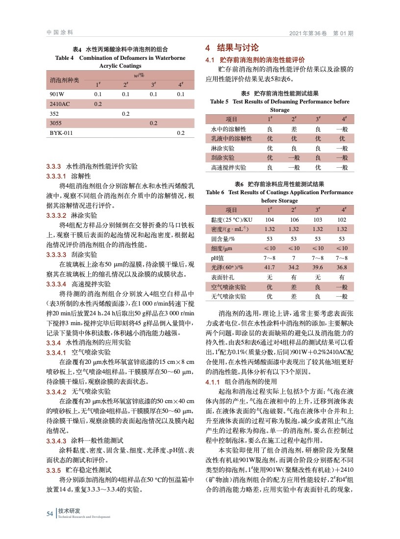 對水性涂料中氣泡的產生及穩定進行了闡述,同時介紹了消泡劑的種類及特點。通過溶解性實驗、高速攪拌實驗以及應用實驗,評價了4組不同種類的消泡劑組合在單組分水性丙烯酸面漆中的消泡性能,并討論了影響水性涂料泡沫的因素。