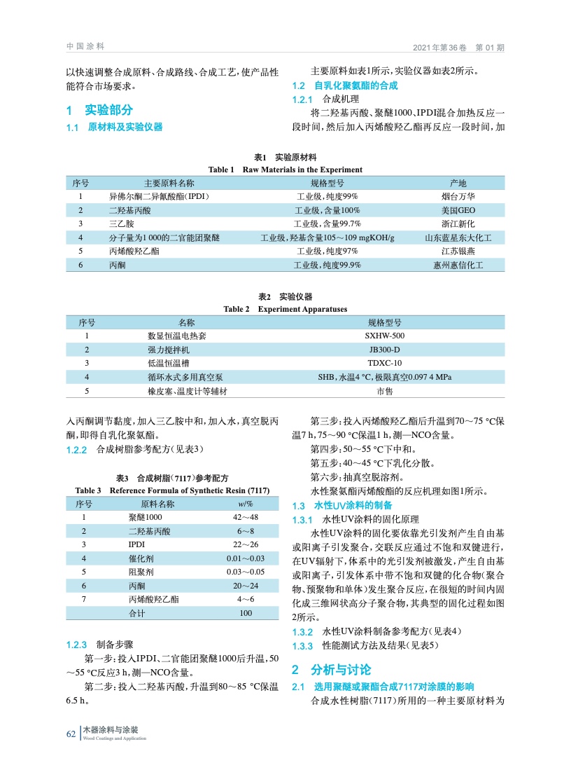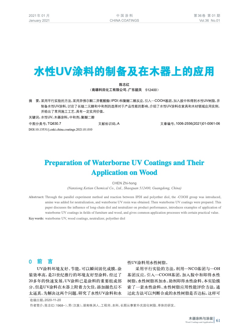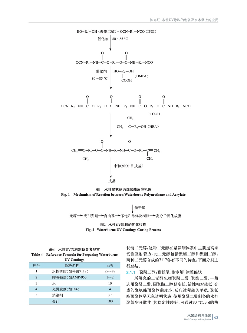 采用平行實驗的方法,采用異佛爾酮二異氰酸酯(IPDI)和聚醚二醇反應,引入—COOH基團,加入胺中和得到水性UV樹脂,并制備水性UV涂料,討論了長鏈二元醇和中和劑的選擇對于產品性能的影響。介紹了水性UV涂料在家具和木材領域應用實例,并給出了常用施工工藝,具有一定實用價值。