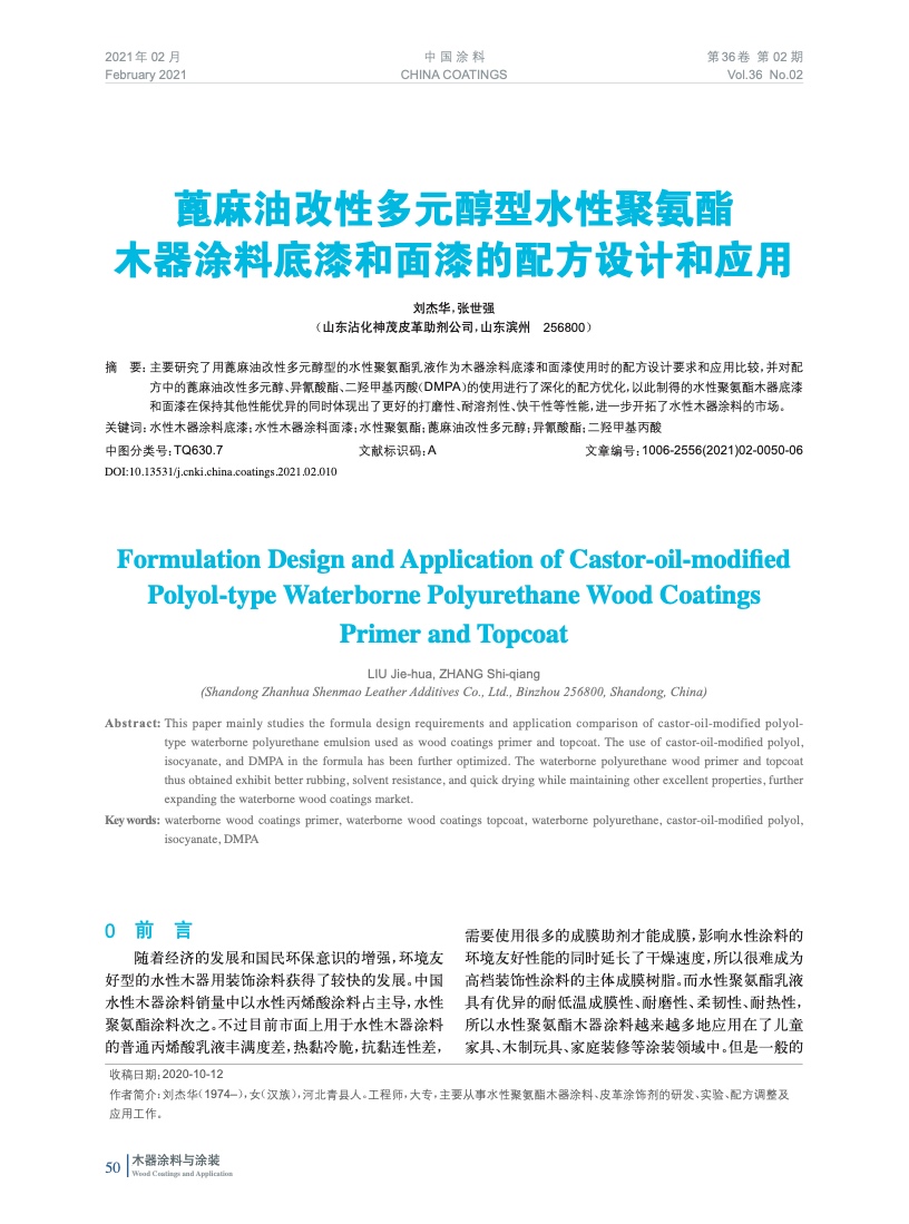 蓖麻油改性多元醇型水性聚氨酯木器涂料底漆和面漆的配方設計和應用