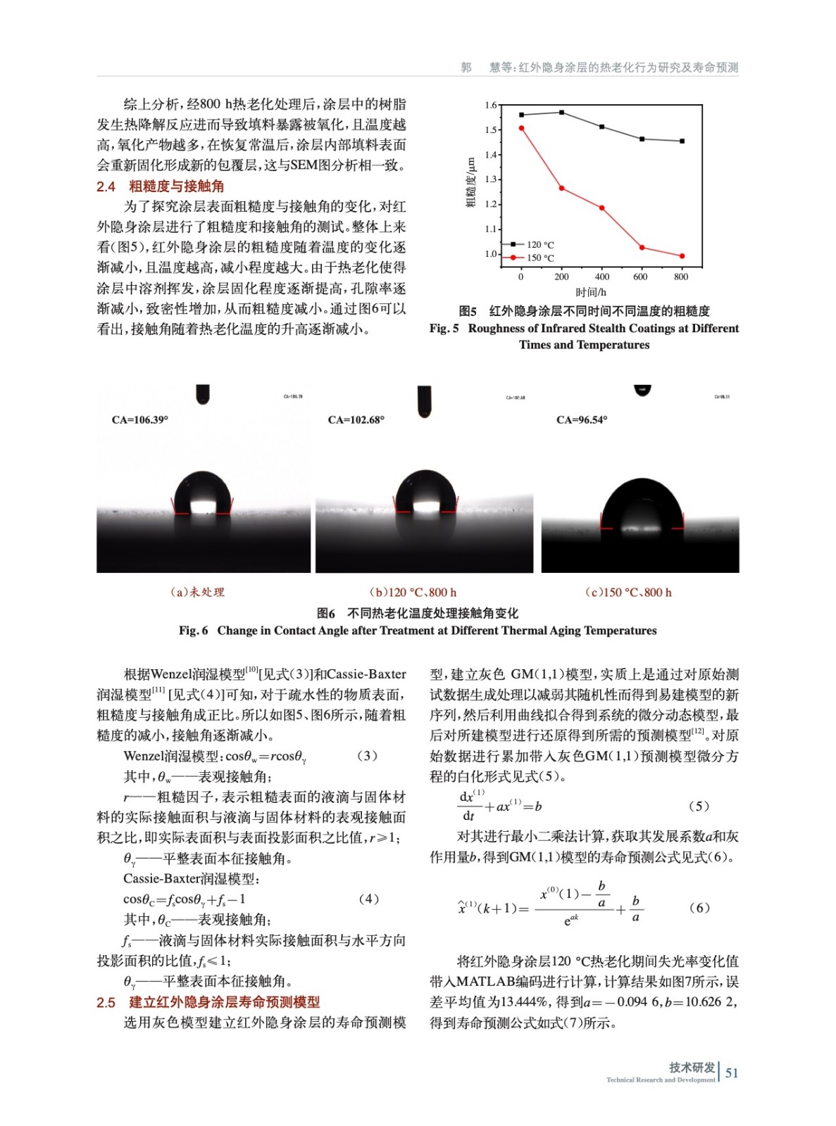 摘要:研究了熱老化對實驗室自制紅外隱身涂層性能的影響規(guī)律,建立了相應(yīng)的壽命預測模型。結(jié)果表明,隨著熱老化時間的延長,涂層中鋁粉出現(xiàn)熱氧化,高分子樹脂發(fā)生熱分解;隨著熱老化溫度的上升,引起表面結(jié)構(gòu)改變,導致粗糙度下降,接觸角下降。最后,根據(jù)紅外隱身涂層熱老化試驗的光澤度值,應(yīng)用灰色模型實現(xiàn)對紅外隱身涂層使用壽命的準確預測,誤差平均值為13.444%。
