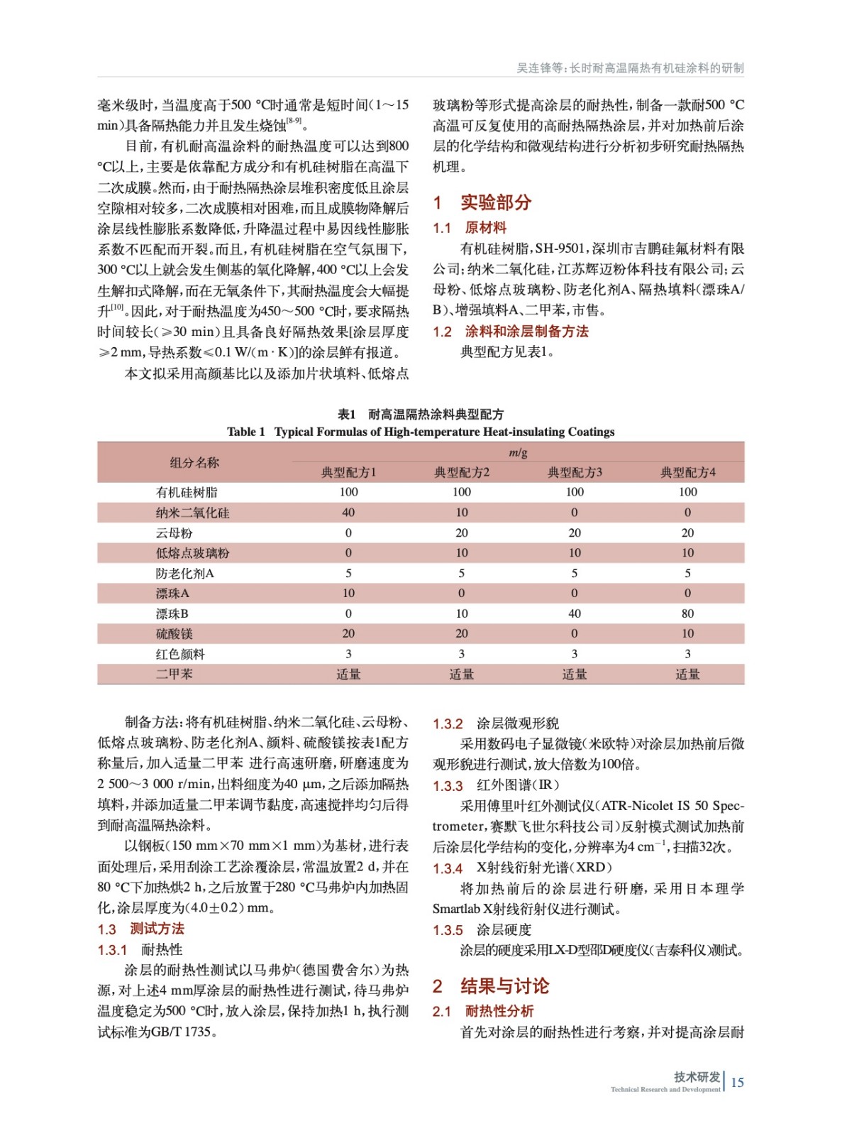 摘要:以有機硅為成膜物,復配高效隔熱填料和增強填料等,制備了一種可以耐受500 ℃、1 h,且不發生起泡、開裂、脫落可反復使用的耐高溫隔熱有機涂料。對涂層進行測試,發現該涂層具備良好的耐熱性。復配高效隔熱填料質量分數為80%時,涂層具有良好的隔熱性能。并且,對涂層的耐高溫隔熱的原理進行了分析,發現耐熱填料、助溶劑和隔熱填料等有效復配是涂層耐熱隔熱的關鍵。