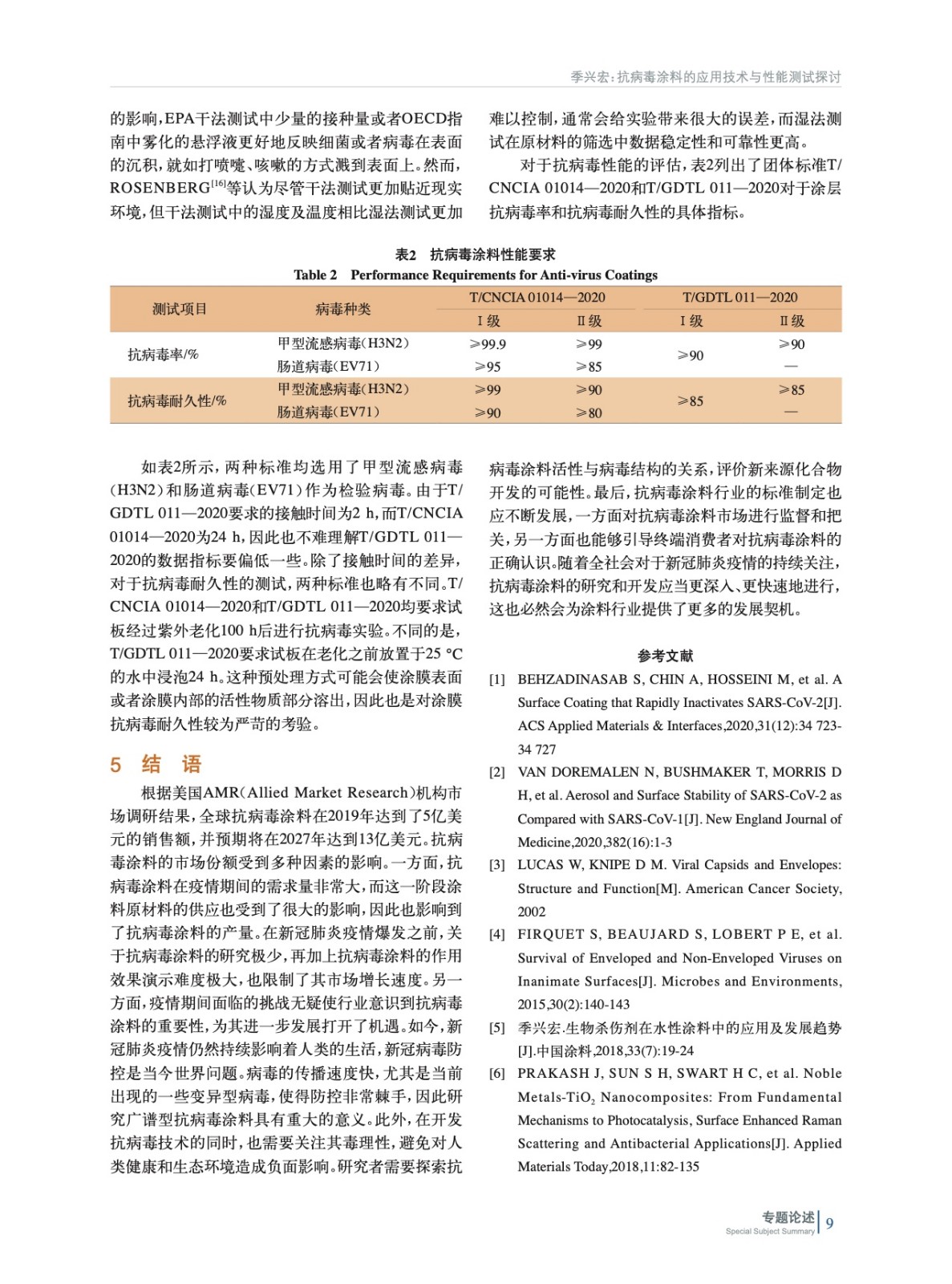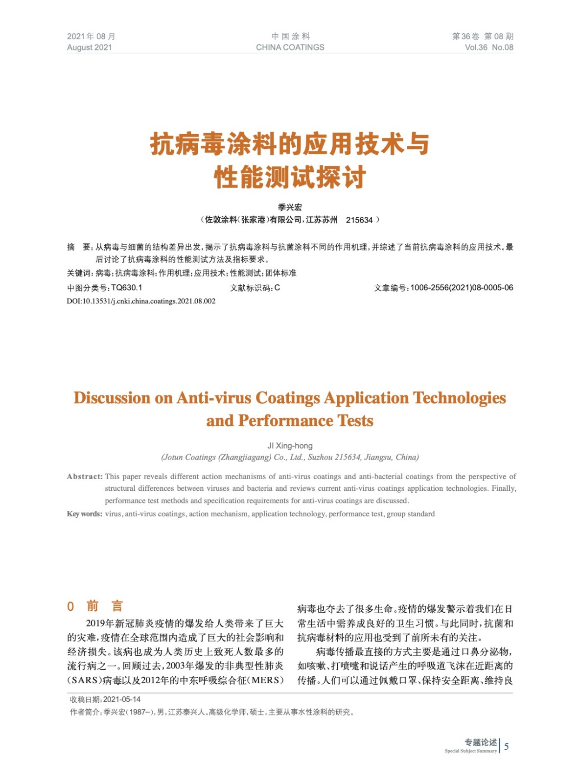 摘要:從病毒與細(xì)菌的結(jié)構(gòu)差異出發(fā),揭示了抗病毒涂料與抗菌涂料不同的作用機(jī)理,并綜述了當(dāng)前抗病毒涂料的應(yīng)用技術(shù)。最后討論了抗病毒涂料的性能測(cè)試方法及指標(biāo)要求。