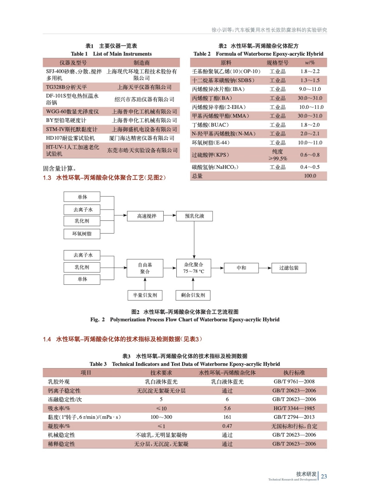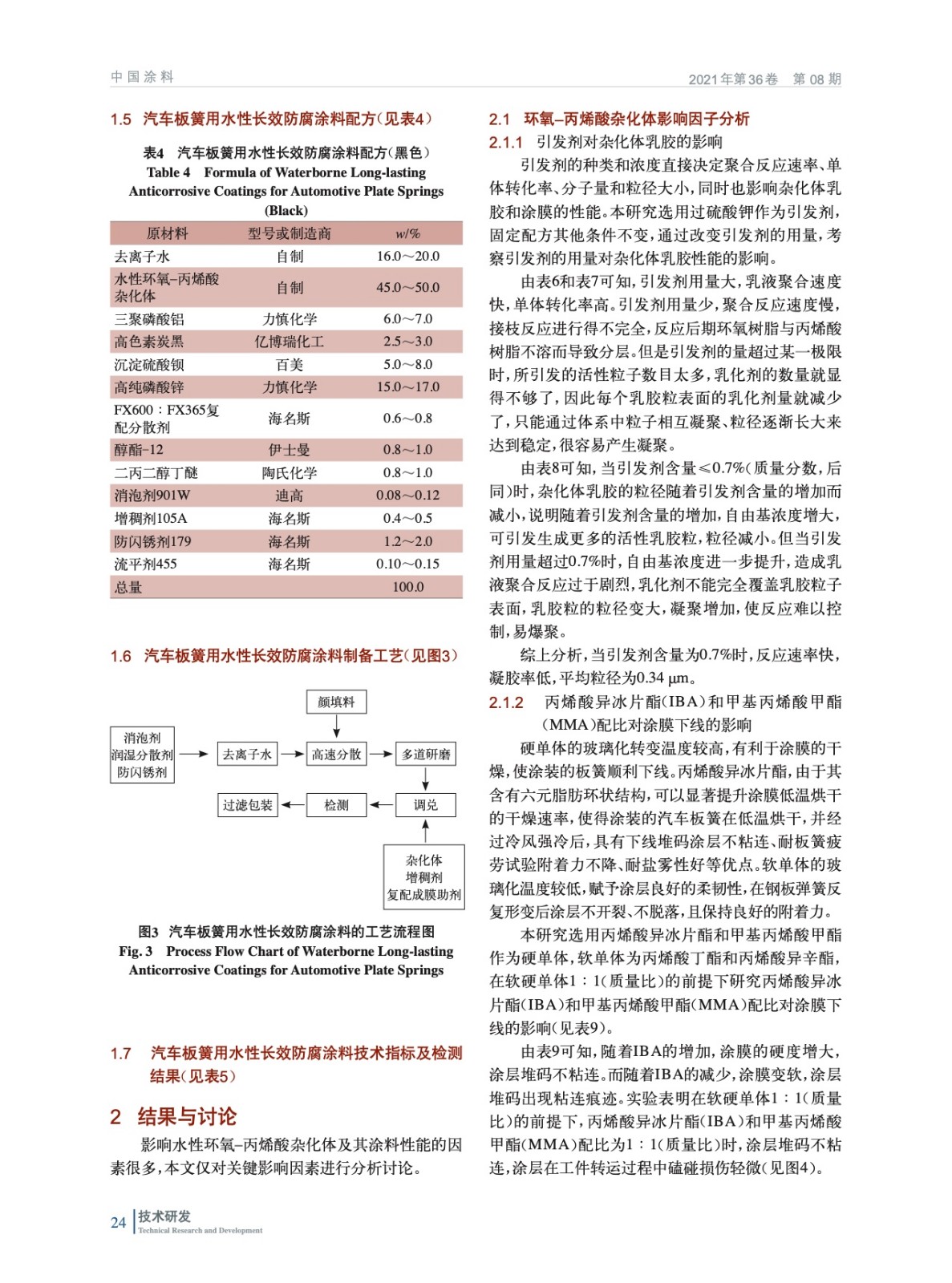 摘要:在乳液聚合體系下進行雜化反應,制備的水性環(huán)氧–丙烯酸雜化體既具有丙烯酸樹脂良好的耐候性,又具有環(huán)氧樹脂附著力強、涂膜硬度高、耐鹽霧性優(yōu)異的特點。研究了引發(fā)劑、丙烯酸異冰片酯、環(huán)氧樹脂、丁烯酸等因素對乳液雜化聚合的影響。確定了汽車板簧用水性長效防腐涂料的最佳配方,探究了各種添加劑、防銹顏料對涂膜性能的影響。