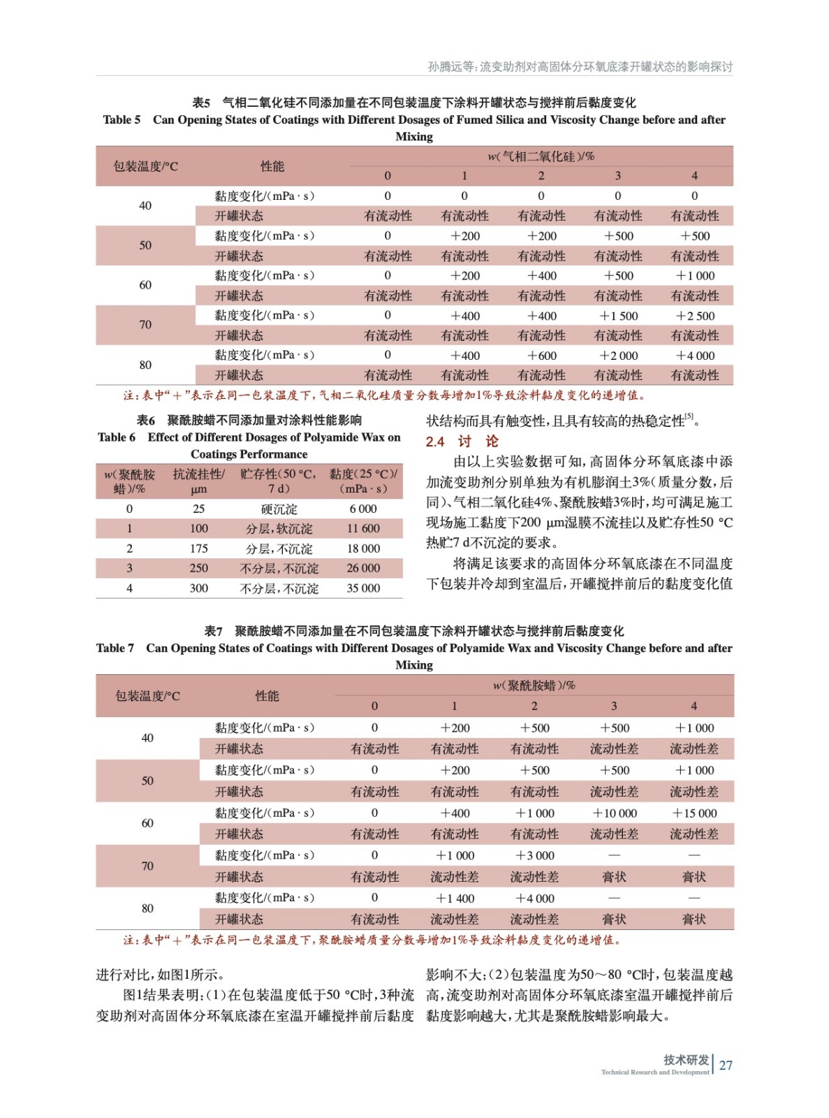 摘要:以高固體分環(huán)氧底漆為研究對象,考察了制備過程中聚酰胺蠟、氣相二氧化硅以及有機(jī)膨潤土3種流變助劑對其開罐狀態(tài)的影響。結(jié)果表明,在滿足性能前提下:(1)添加有機(jī)膨潤土或氣相二氧化硅的高固體分環(huán)氧底漆車間生產(chǎn)包裝時,包裝溫度對其開罐攪拌前后黏度變化影響較小,開罐狀態(tài)較好;(2)包裝溫度越高,添加聚酰胺蠟的高固體分環(huán)氧底漆開罐攪拌前后黏度變化越大,即包裝溫度越高,開罐狀態(tài)越差。