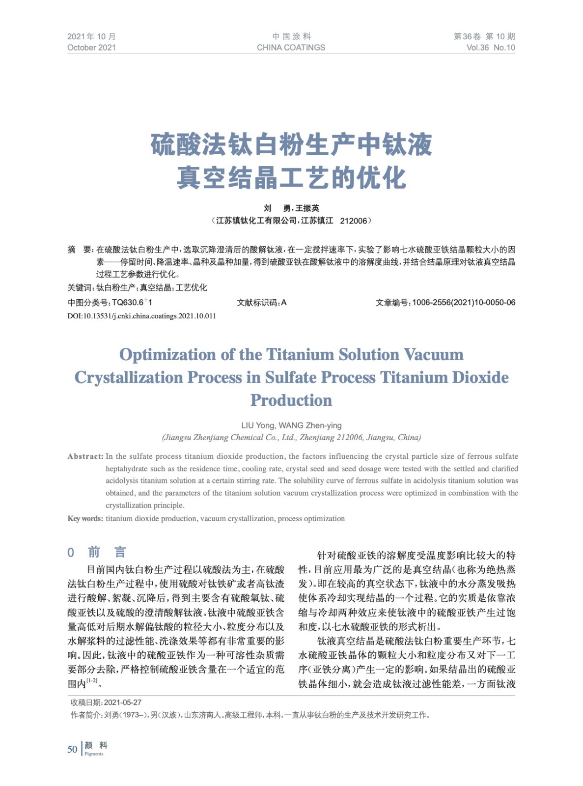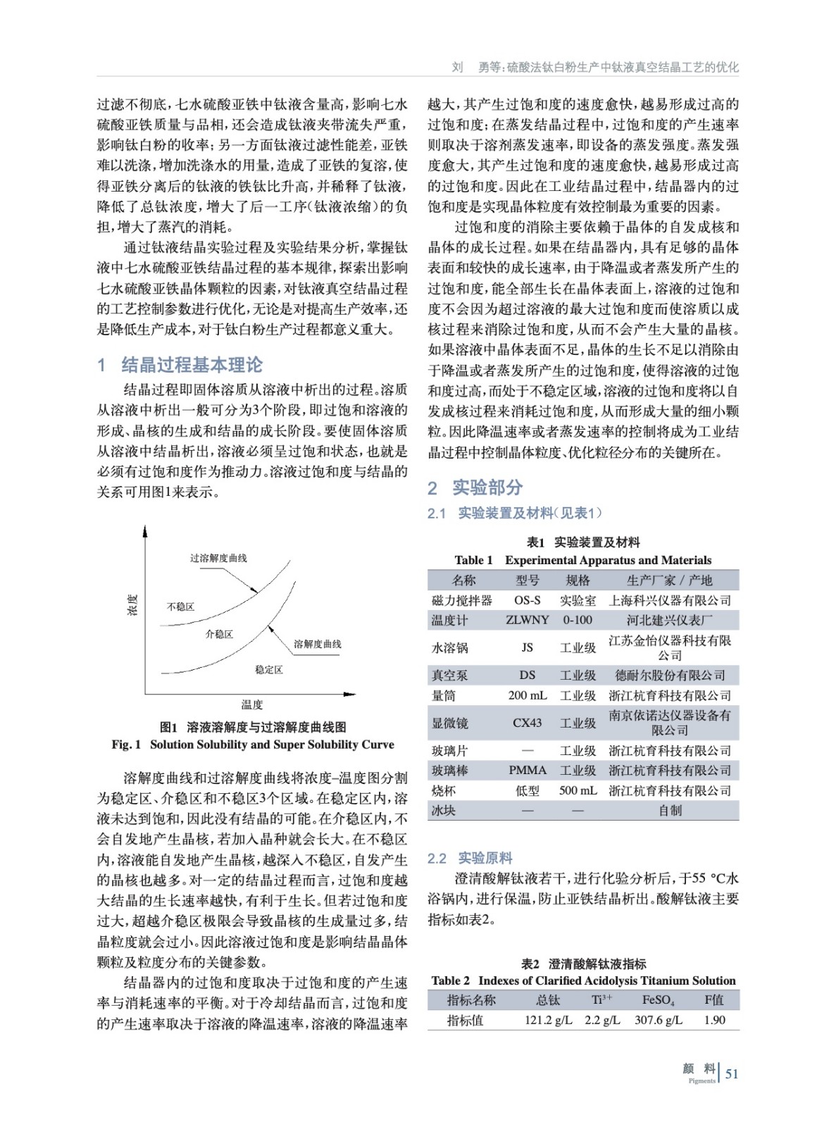 摘要:在硫酸法鈦白粉生產(chǎn)中,選取沉降澄清后的酸解鈦液,在一定攪拌速率下,實(shí)驗(yàn)了影響七水硫酸亞鐵結(jié)晶顆粒大小的因素——停留時(shí)間、降溫速率、晶種及晶種加量,得到硫酸亞鐵在酸解鈦液中的溶解度曲線,并結(jié)合結(jié)晶原理對鈦液真空結(jié)晶過程工藝參數(shù)進(jìn)行優(yōu)化。