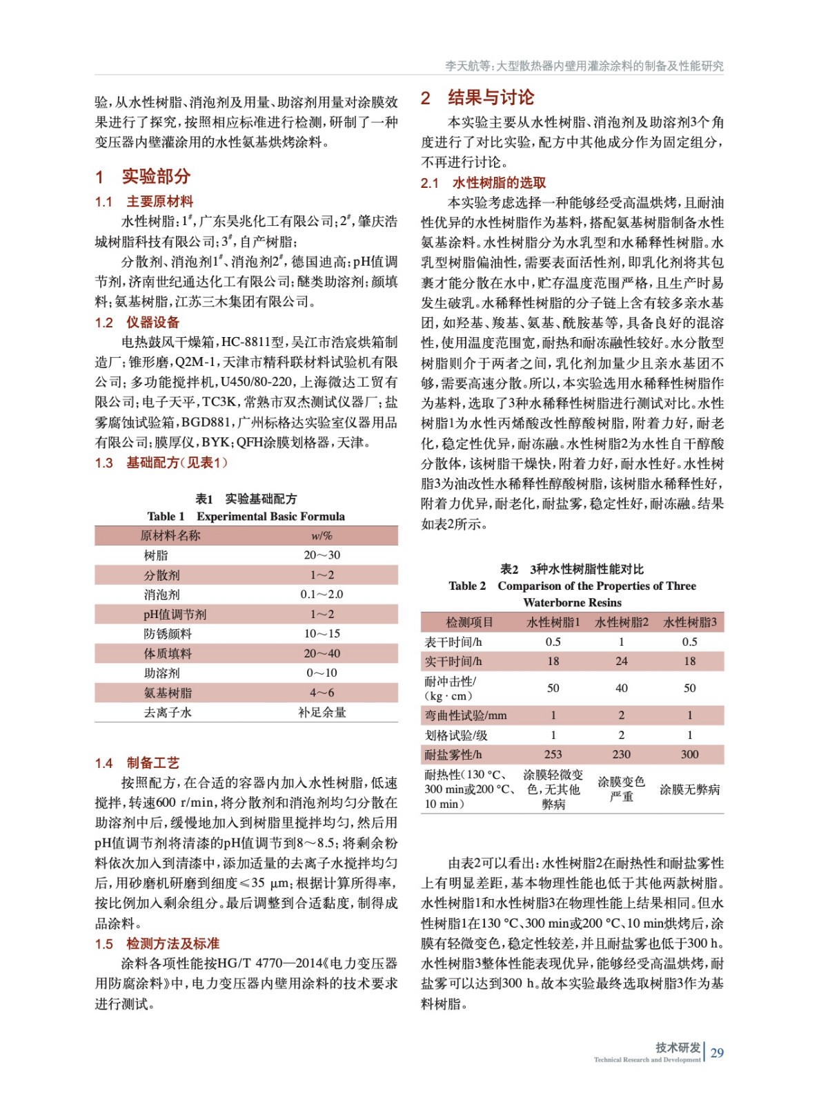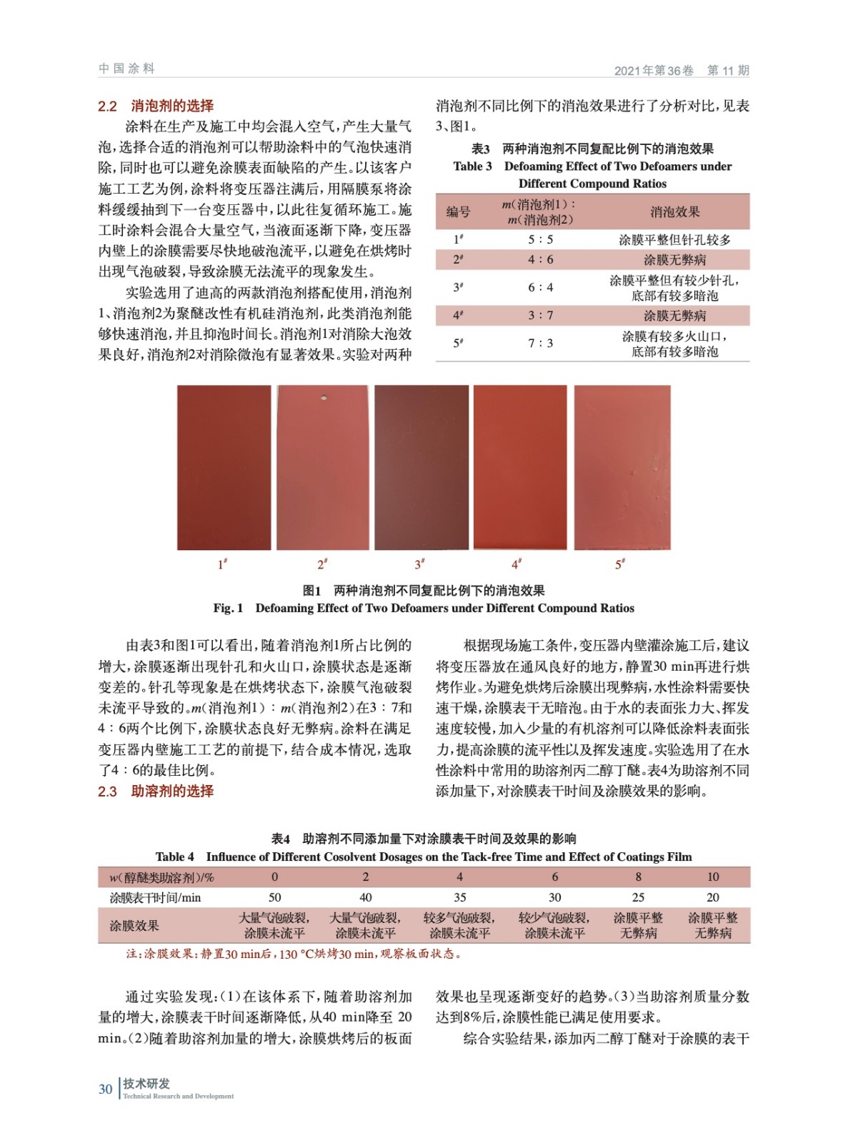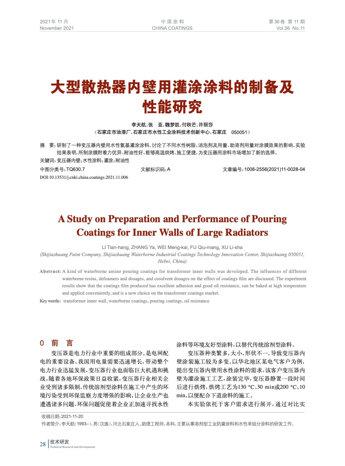 研制了一種變壓器內壁用水性氨基灌涂涂料,討論了不同水性樹脂、消泡劑及用量、助溶劑用量對涂膜效果的影響。實驗結果表明,所制涂膜附著力優異、耐油性好,能夠高溫烘烤,施工便捷,為變壓器用涂料市場增加了新的選擇。
