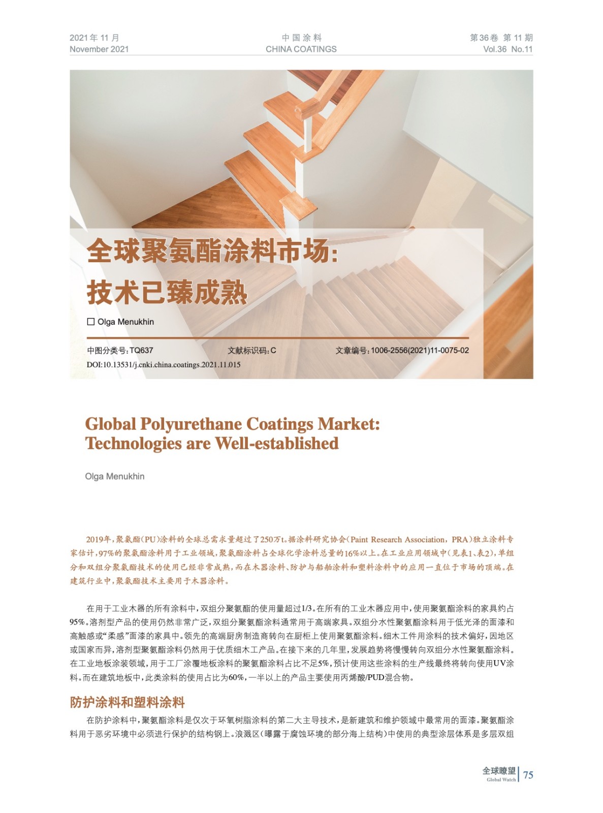 摘要:編者按:2019年,聚氨酯涂料的全球總需求量超過了250萬t。據涂料研究協會(Paint Research Association)獨立涂料專家估計,97%的聚氨酯涂料用于工業領域,聚氨酯涂料占全球化學涂料總量的16%以上。在工業應用領域中,單組分和雙組分聚氨酯技術的使用已經非常成熟,而在木器涂料、防護與船舶涂料和塑料涂料中的應用一直位于市場的頂端。在建筑行業中,聚氨酯技術主要用于木器涂料。