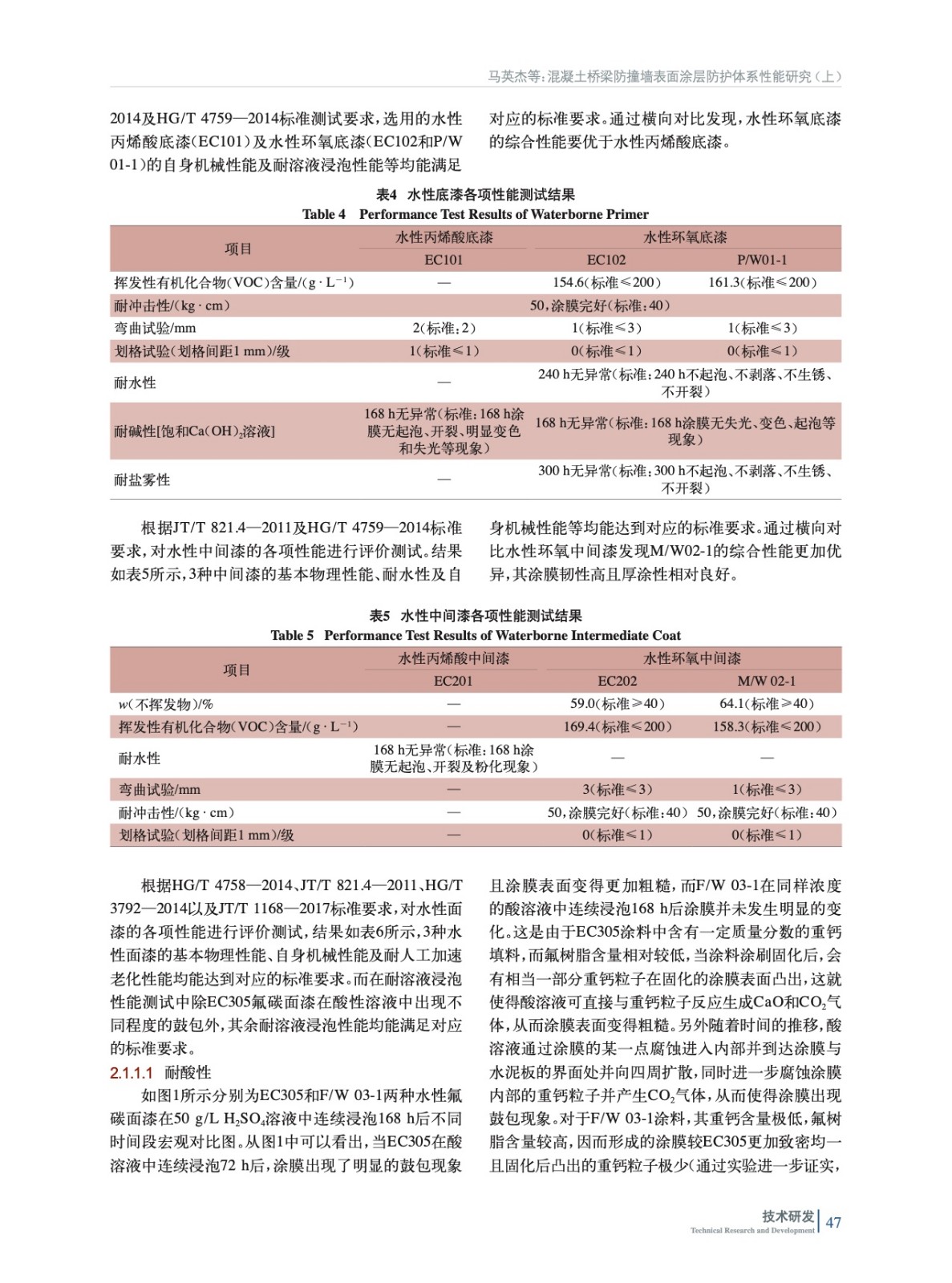 摘要:針對混凝土橋梁防撞墻極易受外界復(fù)雜腐蝕環(huán)境影響并造成嚴(yán)重?fù)p傷問題,本研究以“底漆+中間漆+面漆”的復(fù)合涂層體系作為設(shè)計方案,分別采用3種水性和3種高固體分溶劑型混凝土表面復(fù)合防護(hù)涂層體系,根據(jù)相應(yīng)標(biāo)準(zhǔn)分別對它們進(jìn)行了系統(tǒng)性評價研究。