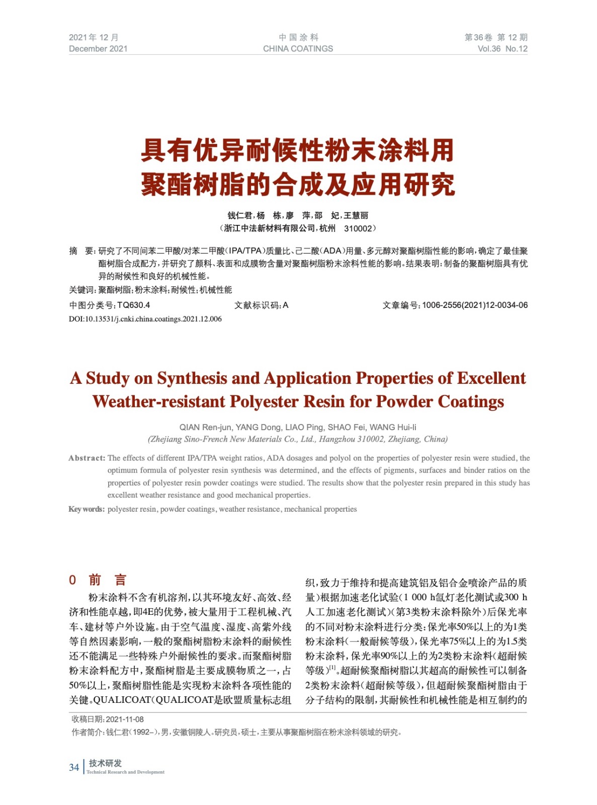 本文系作者@錢仁君,楊 棟,廖 萍,邵 妃,王慧麗 授權中國涂料網發表,并經中國涂料網編輯,未經允許不得轉載,如需轉載請聯系chinacoatingnet@vip.163.com