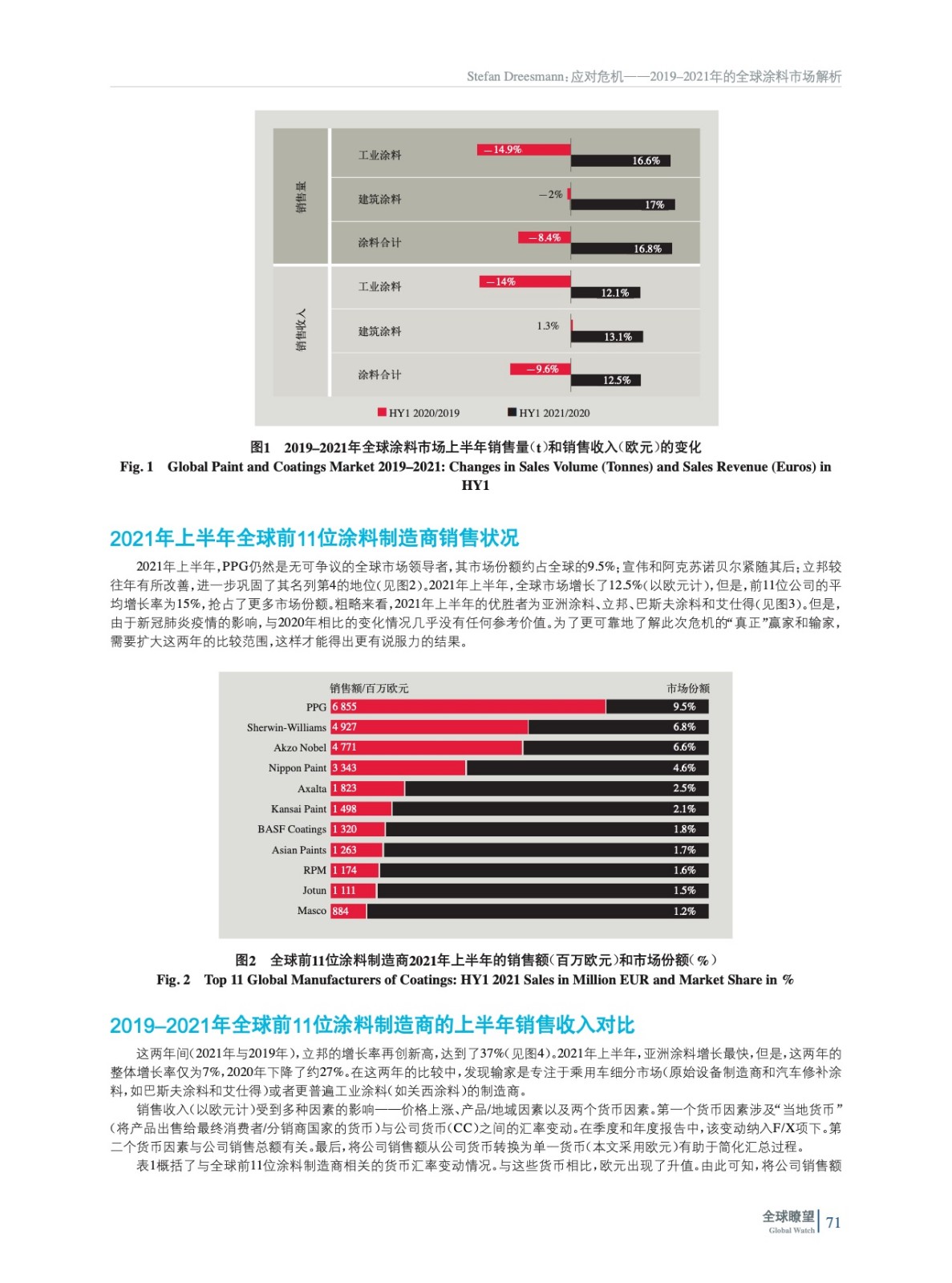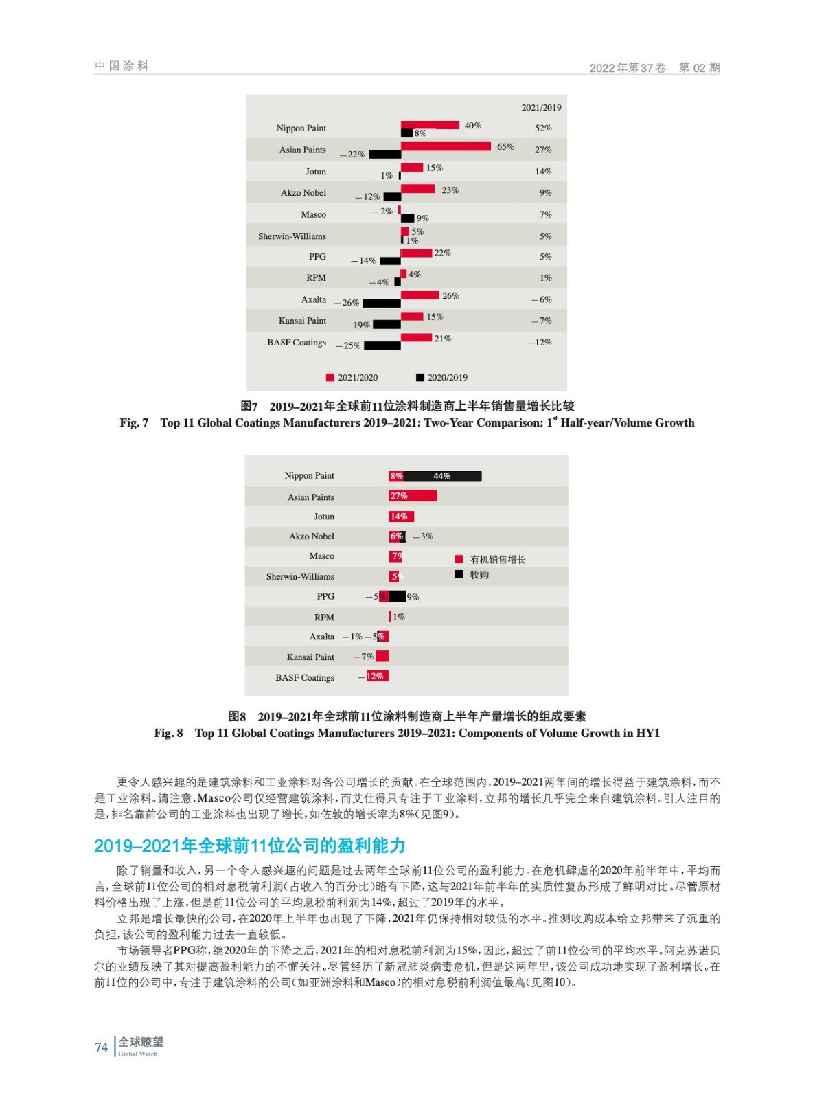 摘要:編者按:過去兩年,在涂料行業(yè)的前11位涂料制造商中,哪些公司能夠最好地應(yīng)對新冠肺炎疫情危機(jī)?在涂料行業(yè)跨國公司的2021年上半年財(cái)務(wù)報告中,銷售增長令人眼花繚亂。那么,“一切都好起來了”嗎?本文將進(jìn)一步深入研究這些公司的銷售額、銷售量,分析“有機(jī)銷售增長”和“收購”,以及“建筑涂料”和“工業(yè)涂料”細(xì)分市場的相對變化。最后,將快速了解這些公司的盈利能力。