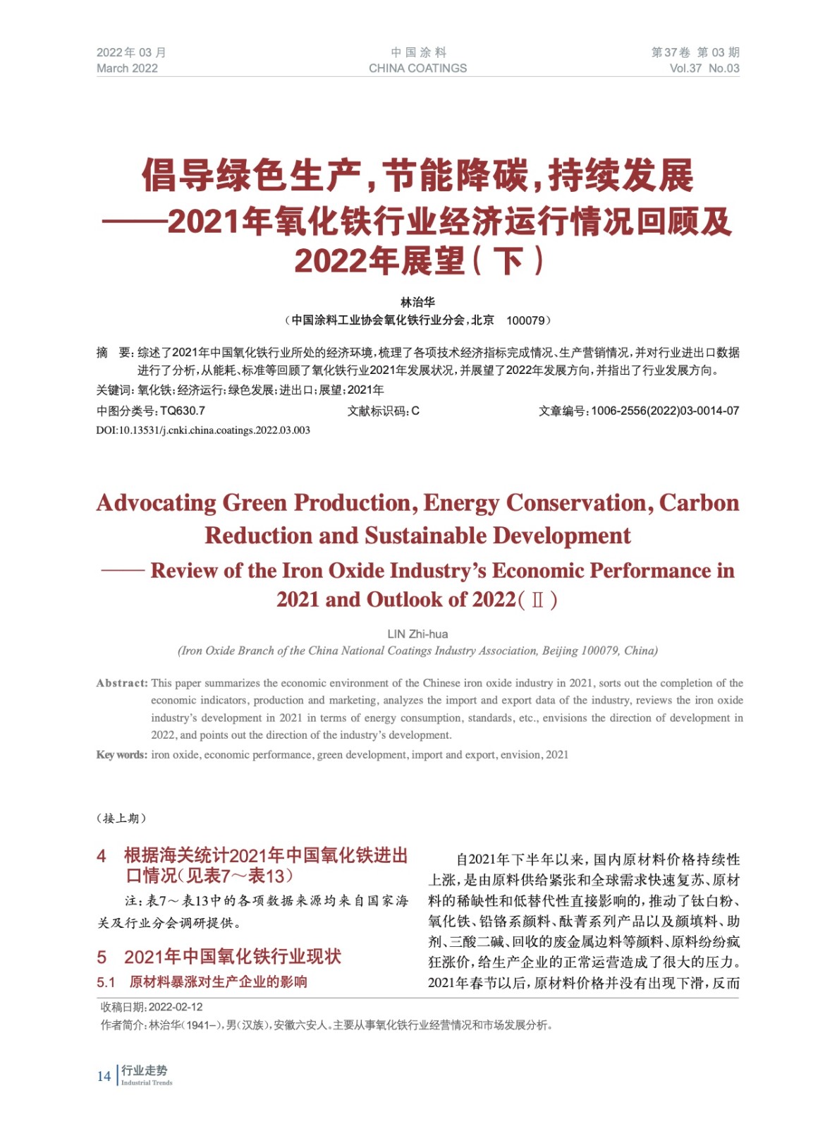 摘要:綜述了2021年中國氧化鐵行業(yè)所處的經(jīng)濟環(huán)境,梳理了各項技術(shù)經(jīng)濟指標(biāo)完成情況、生產(chǎn)營銷情況,并對行業(yè)進出口數(shù)據(jù)進行了分析,從能耗、標(biāo)準(zhǔn)等回顧了氧化鐵行業(yè)2021年發(fā)展?fàn)顩r,并展望了2022年發(fā)展方向,并指出了行業(yè)發(fā)展方向。