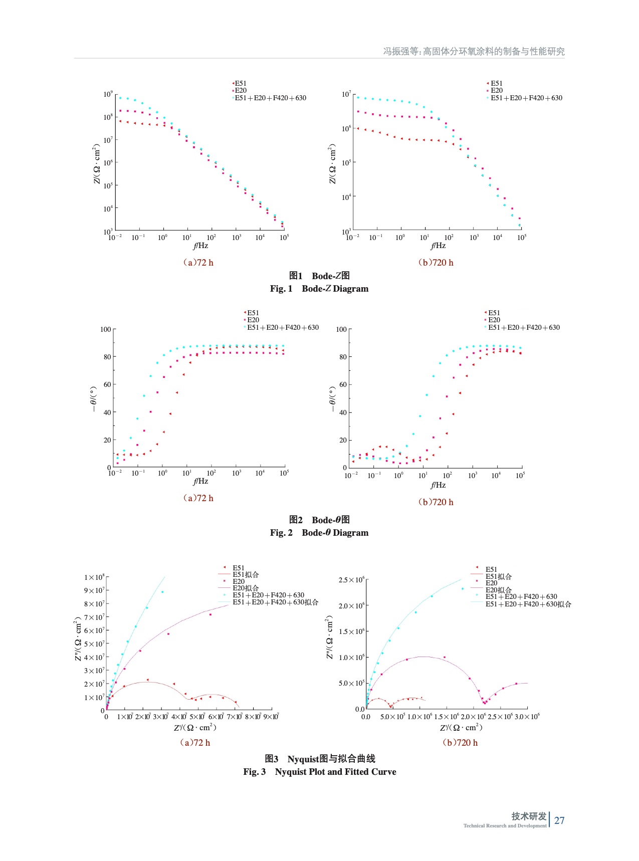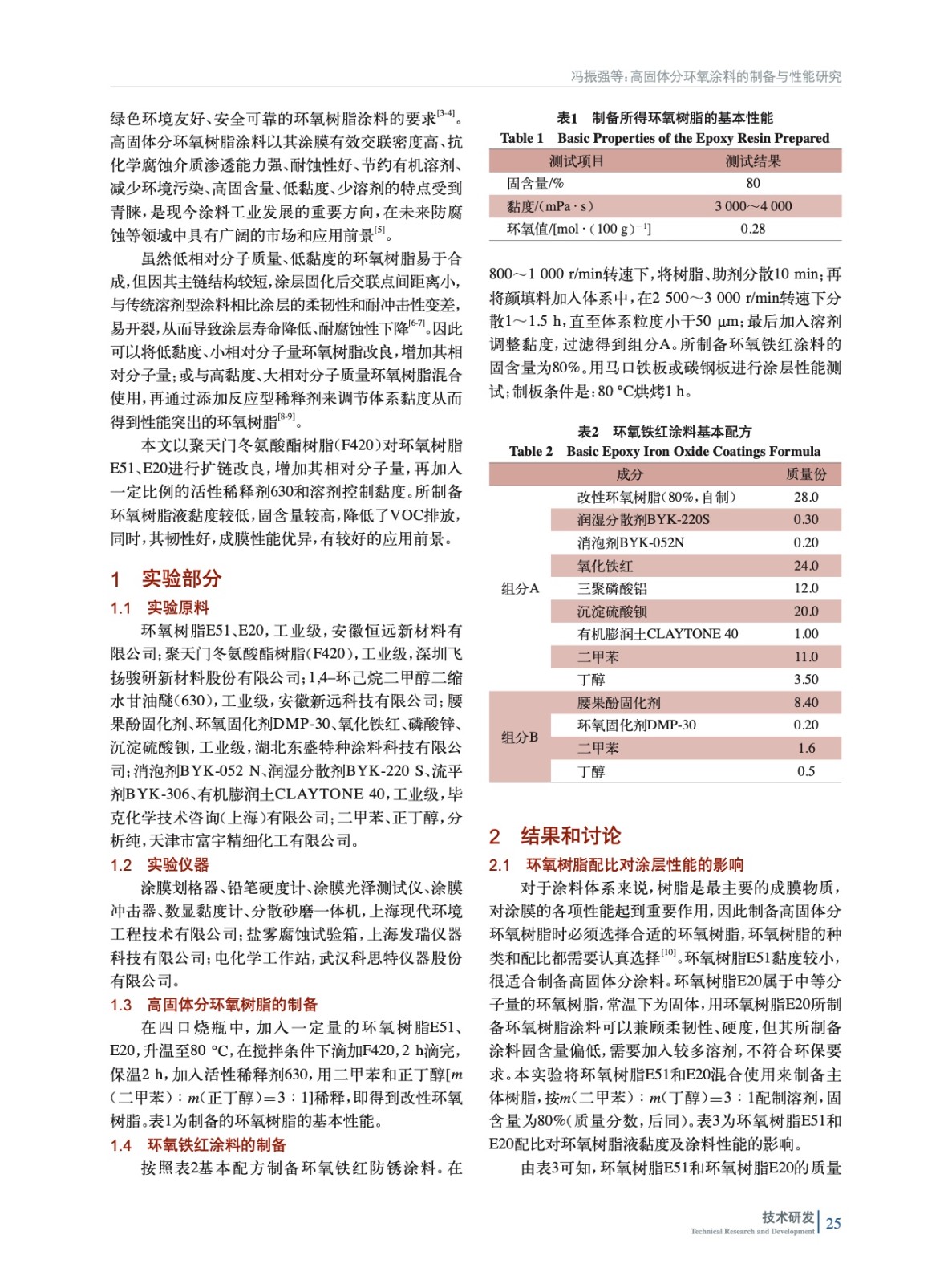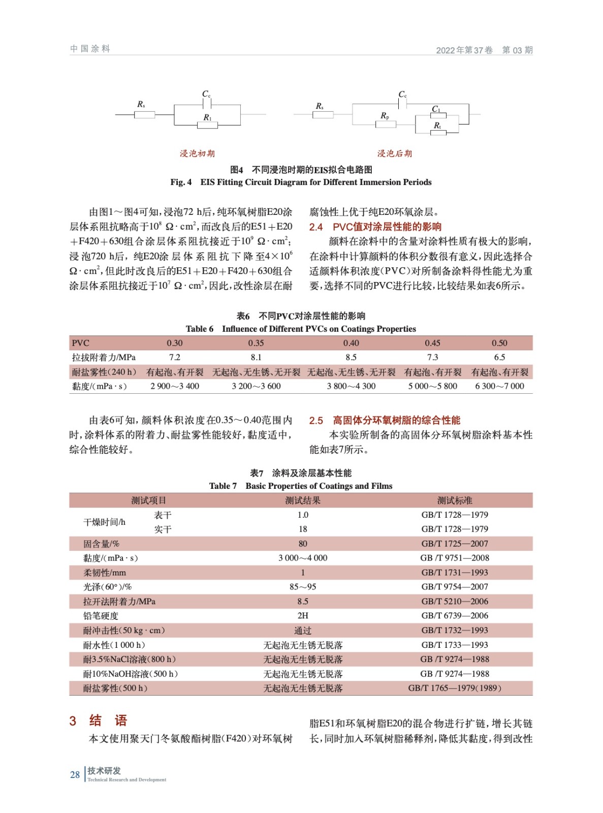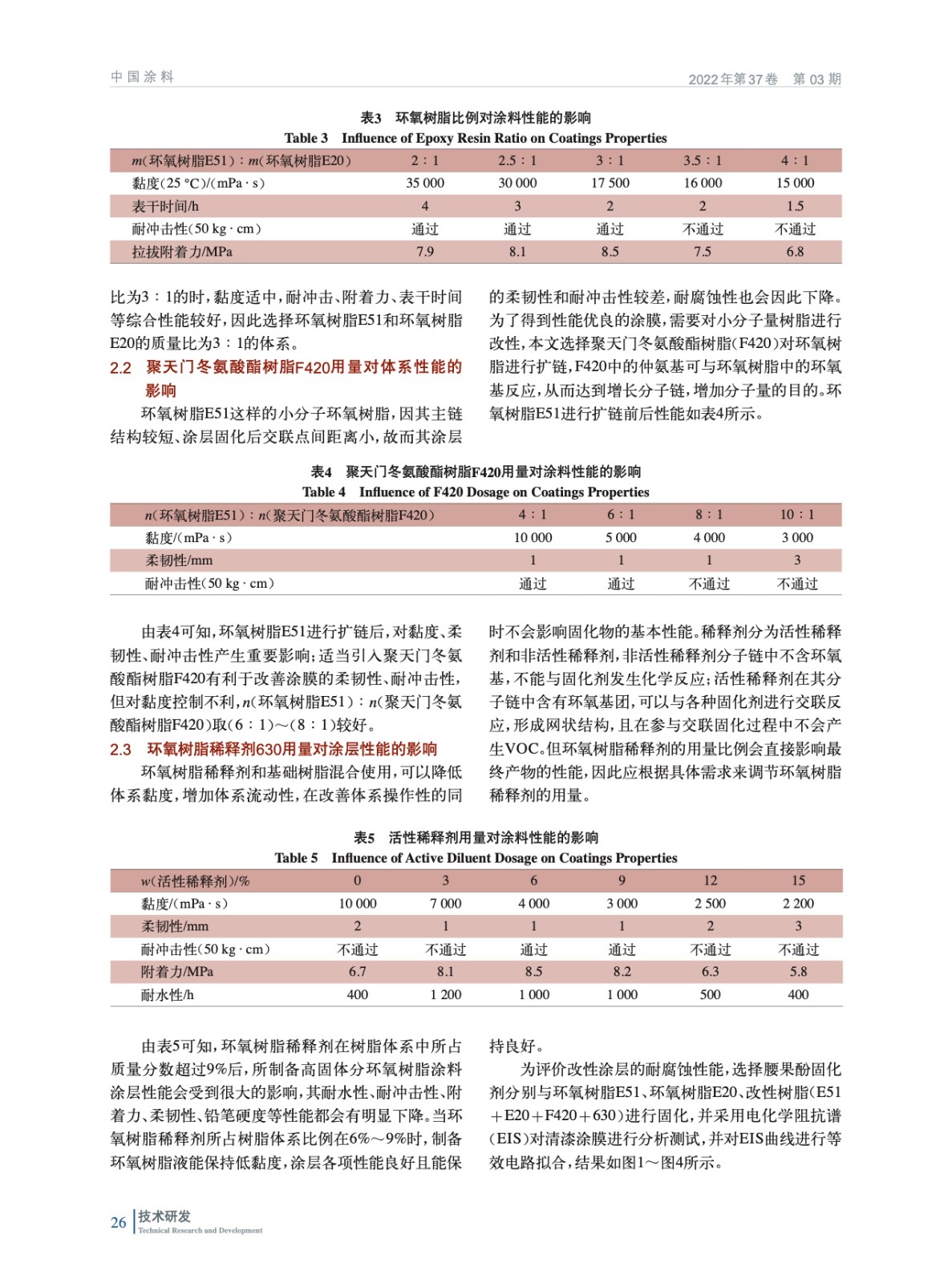 摘要:將環氧樹脂E51、E20與聚天門冬氨酸酯樹脂(F420)反應,加入活性稀釋劑1,4–環己烷二甲醇二縮水甘油醚(630)調節黏度,得到改性環氧樹脂。該改性環氧樹脂與腰果酚固化劑配伍可以得到高固體分環氧樹脂涂料;最終得到優化的配方為:m(環氧樹脂E51)∶m(環氧樹脂E20)為3∶1,n(環氧樹脂E51)∶n(聚天門冬氨酸酯樹脂F420)為6∶1,活性稀釋劑630用量為6%~9%。