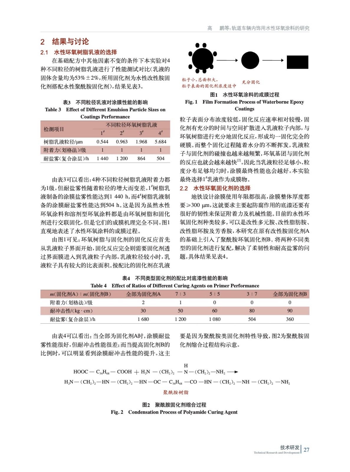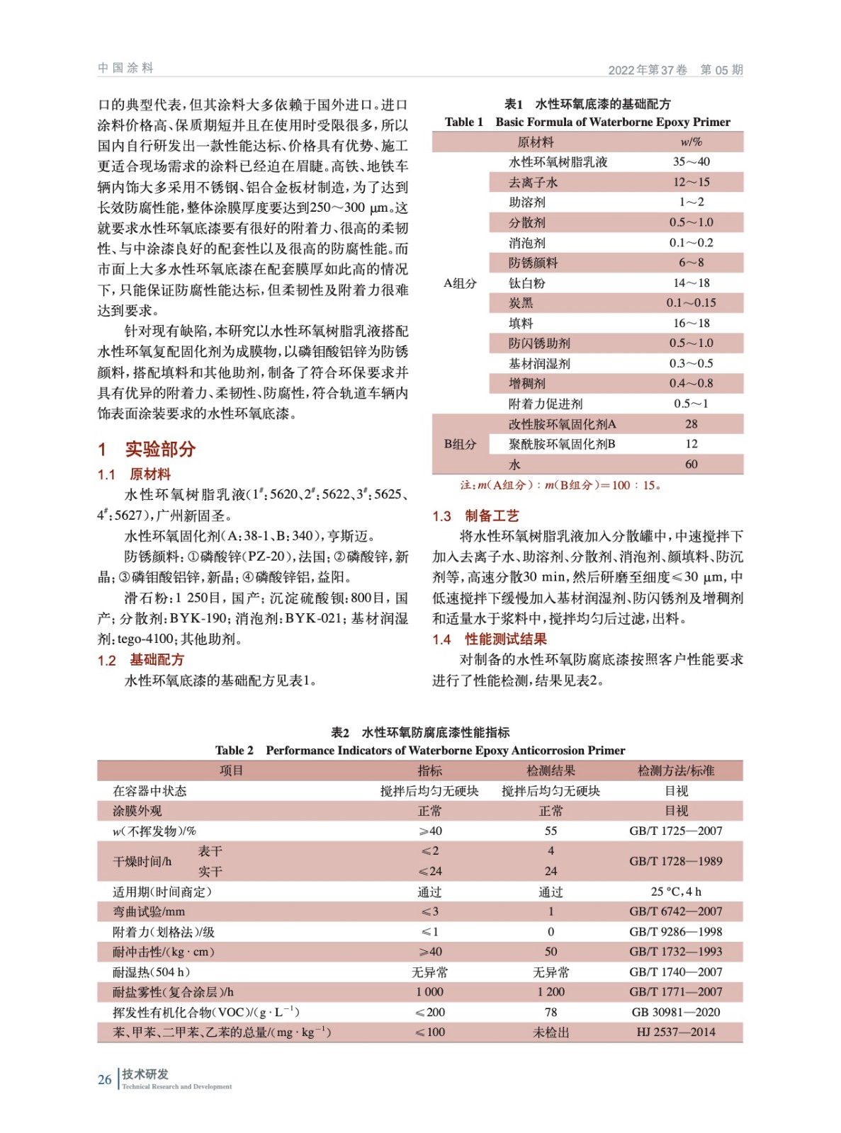 摘要:以小粒徑環氧樹脂乳液搭配改性胺和聚酰胺復配固化劑為主要成膜物,選用磷鉬酸鋁鋅為防銹顏料制備了符合環保要求并滿足軌道車輛內飾表面涂裝要求的水性環氧涂料。考察結果表明:活潑氫當量與環氧當量比選擇0.9,并且搭配磷鉬酸鋁鋅作為防銹顏料制備的涂料滿足要求,適用于較難附著的不銹鋼、鋁合金等多種金屬基材的防腐保護。