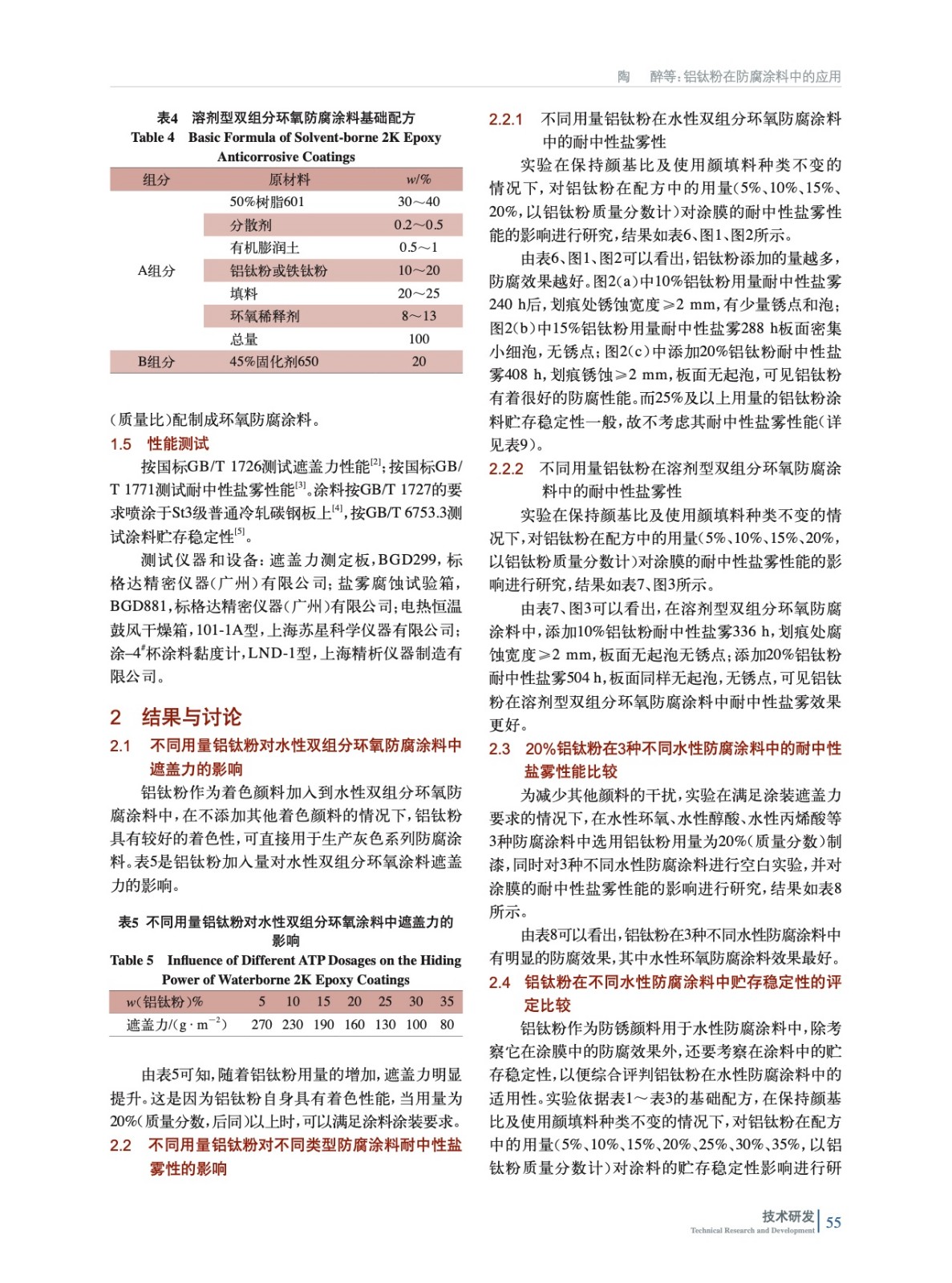 摘要:通過對鋁鈦粉在各類防腐涂料中的應(yīng)用實(shí)驗(yàn),結(jié)果表明鋁鈦粉具有良好的防腐性能,其用量在20%時,涂料綜合性能良好,水性雙組分環(huán)氧防腐涂料可耐中性鹽霧408 h,水性醇酸防腐涂料可耐中性鹽霧168 h,水性單組分丙烯酸防腐涂料中達(dá)216 h,溶劑型雙組分環(huán)氧防腐涂料中達(dá)500 h。且通過鋁鈦粉和鐵鈦粉的雙組分環(huán)氧防腐涂料耐中性鹽霧性能對比實(shí)驗(yàn),結(jié)果表明鋁鈦粉的防腐性更優(yōu)。