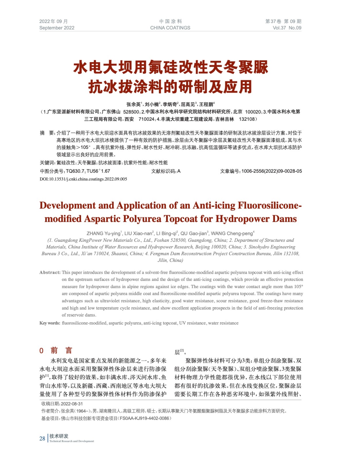 水電大壩用氟硅改性天冬聚脲抗冰拔涂料的研制及應用