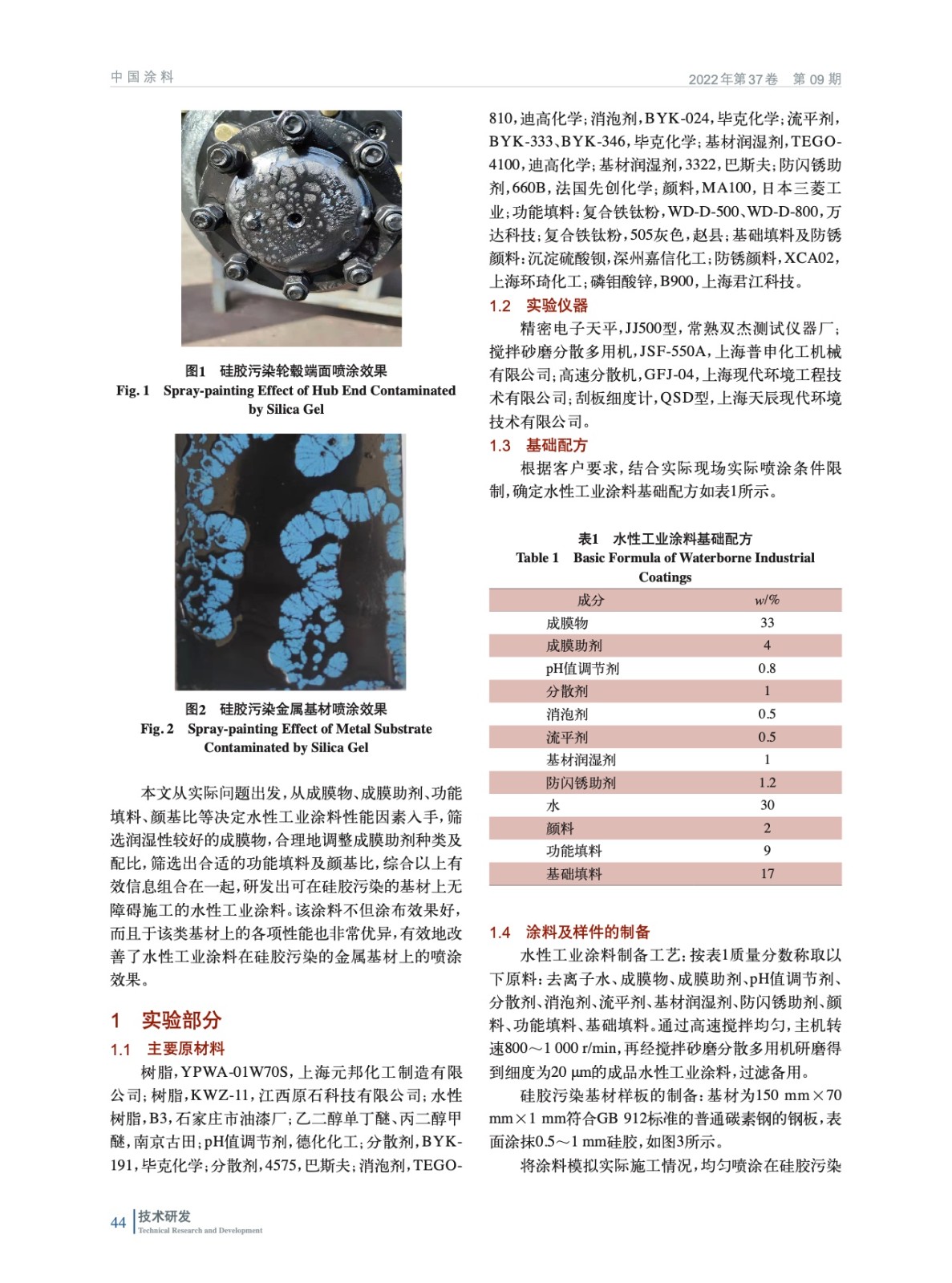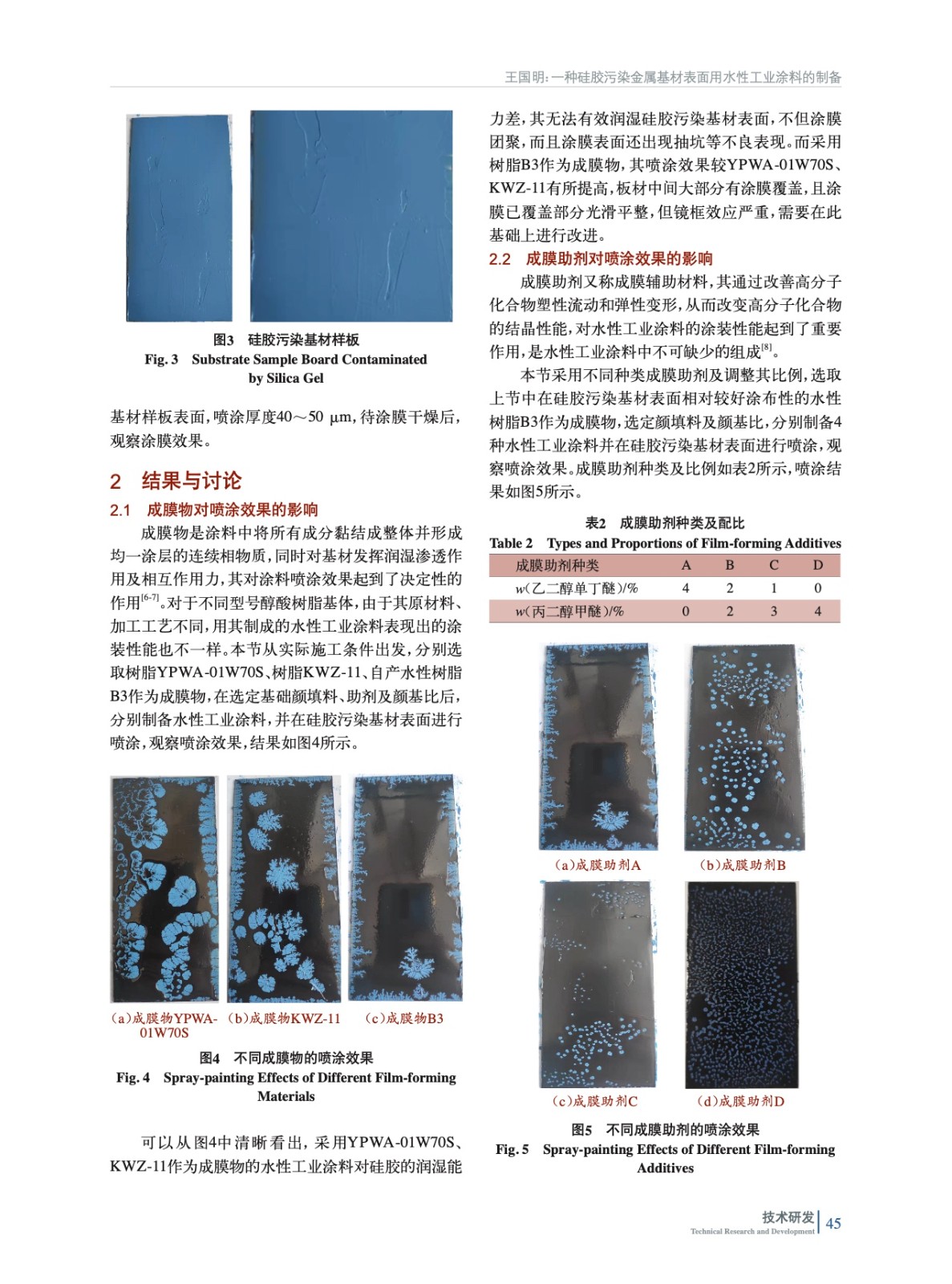 摘要:基于硅膠污染金屬基材表面上,針對一種水性工業涂料中成膜物、成膜助劑、功能填料、顏基比對噴涂效果的影響進行研究。結果表明,當成膜物采用自產樹脂B3,成膜助劑采用乙二醇單丁醚與丙二醇甲醚以質量比1∶3混合,功能填料選取復合鐵鈦粉WD-D-800,顏基比為1.6時,該種水性工業涂料在硅膠污染金屬基材表面具有良好的噴涂效果。
