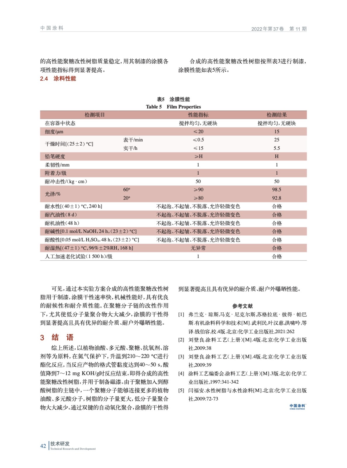 摘要:以植物油酸、多元酸、聚糖、抗氧劑、溶劑等為原料,在氮氣保護下,升溫到210~220 ℃進行酯化反應,合成高性能聚糖改性樹脂,并用于制備磁漆。討論了各種工藝條件對樹脂性能的影響以及后期的制漆性能。結果表明:通過配方的設計,在氣體保護作用下,聚糖加入到醇酸樹脂的主鏈中,一個聚糖分子能夠連接更多的植物油酸、多元酸分子,低分子量聚合物大大減少。通過雙鍵的自動氧化聚合,涂膜的干性得到顯著提高且具有優異的耐介質、戶外曝曬性能。