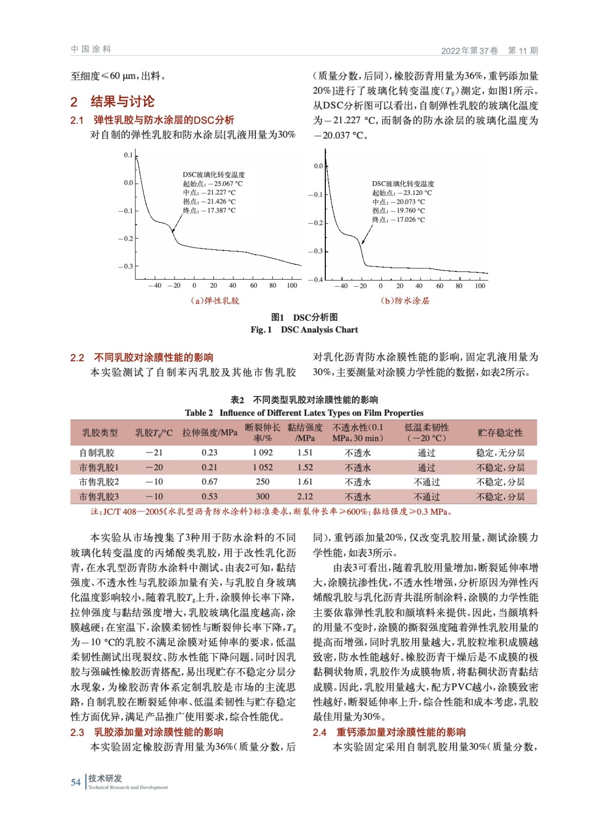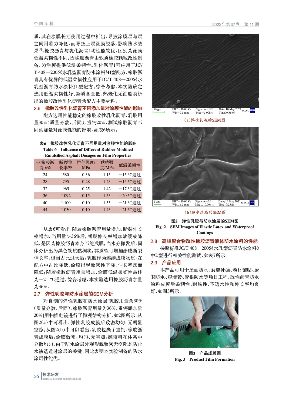 摘要:為了改善水乳型瀝青建筑防水涂料熱黏冷脆的缺點,自制了Tg為-21 ℃的高彈均相苯丙乳膠,探討了聚合物乳液、乳化瀝青的種類及添加量、重鈣的添加量對防水涂膜性能的影響。用掃描電鏡對防水涂層的微觀結構進行了分析,用差熱分析儀DSC、高低溫恒溫恒濕箱、萬能材料試驗機、電動不透水儀等對防水涂層的玻璃化溫度、低溫柔韌性、耐熱度、機械性能、防滲透性能等進行測試。結果表明,當添加自制苯丙乳膠30%(質量分數,后同)、橡膠乳化瀝青36%、重鈣20%時,制備的液體防水涂料涂膜斷裂伸長率為1 092%,低溫柔韌性通過-20 ℃,120 ℃無流淌、滑動。