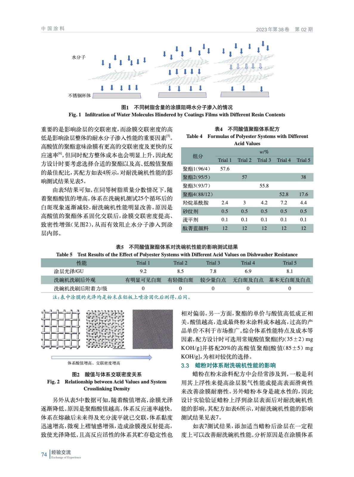 摘要:通過研究樹脂質量分數、不同酸值的聚酯、蠟粉、填料等因素對HAA固化砂紋產品洗碗機白斑問題的影響,得出高樹脂含量的體系有利于洗碗機白斑問題的改善;高酸值聚酯可有效改善洗碗機白斑問題;小分子蠟粉可在一定程度上改善洗碗機白斑問題;二氧化硅填料及氫氧化鋁填料對改善洗碗機白斑問題有幫助,碳酸鈣、云母粉填料在砂紋產品中不能有效改善產品耐洗碗機白斑問題。