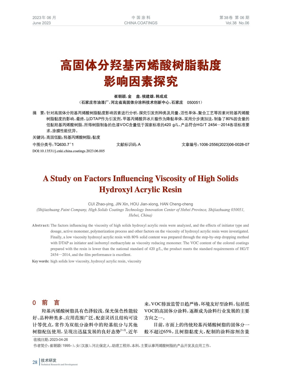高固體分羥基丙烯酸樹脂黏度影響因素探究