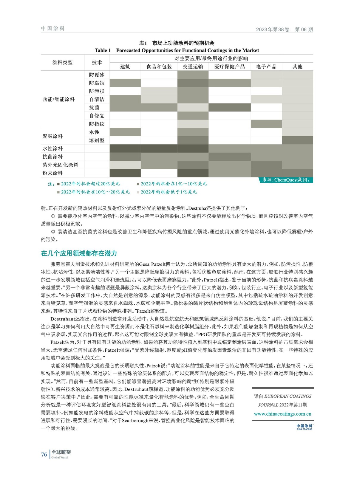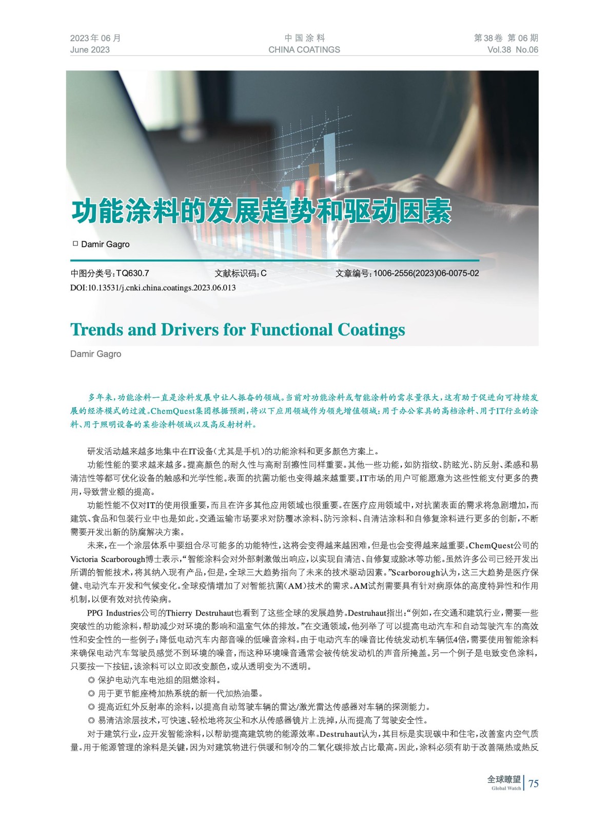 摘要:多年來,功能涂料一直是涂料發(fā)展中讓人振奮的領(lǐng)域。當前對功能涂料或智能涂料的需求量很大,這有助于促進向可持續(xù)發(fā)展的經(jīng)濟模式的過渡。ChemQuest集團根據(jù)預測,將以下應(yīng)用領(lǐng)域作為領(lǐng)先增值領(lǐng)域:用于辦公家具的高檔涂料、用于IT行業(yè)的涂料、用于照明設(shè)備的某些涂料領(lǐng)域以及高反射材料。