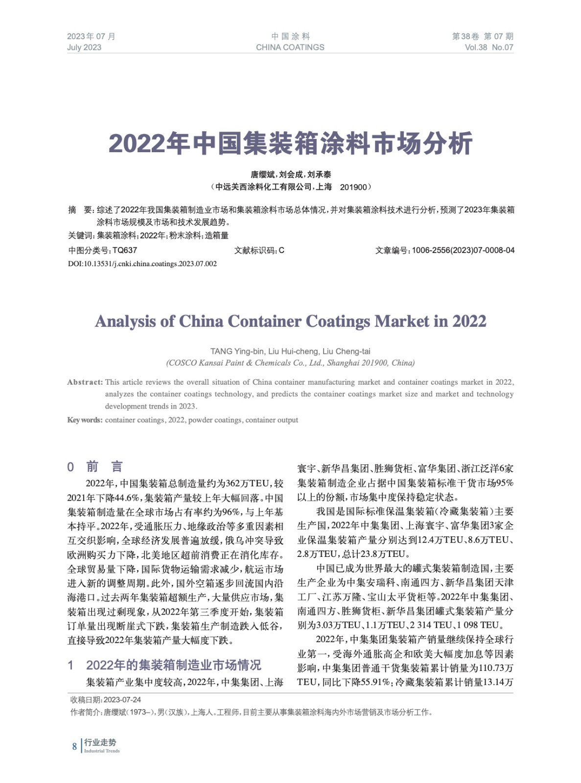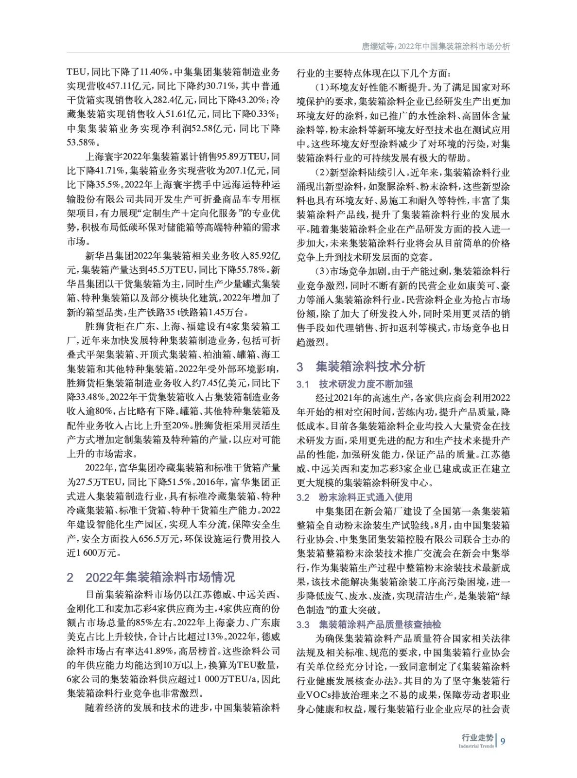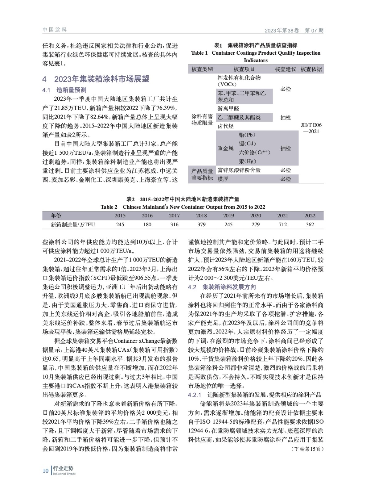 綜述了2022年我國集裝箱制造業市場和集裝箱涂料市場總體情況,并對集裝箱涂料技術進行分析,預測了2023年集裝箱涂料市場規模及市場和技術發展趨勢。