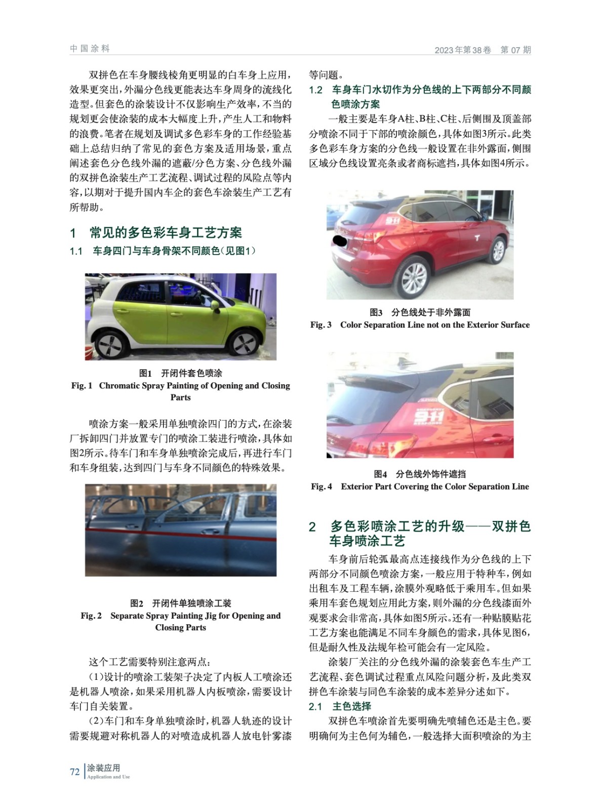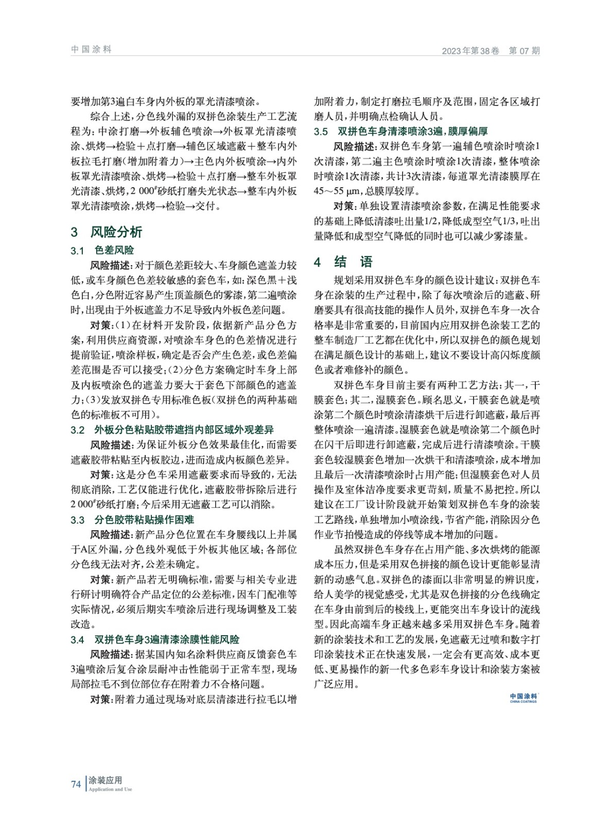 主要介紹了常見的多色彩方案及分色線外漏的雙拼色涂裝生產工藝流程,并探討了雙拼色車身涂裝的廠家風險問題及其防控措施。