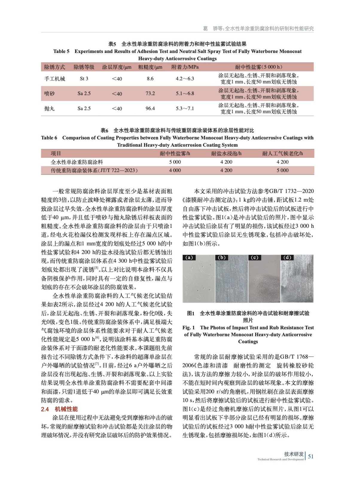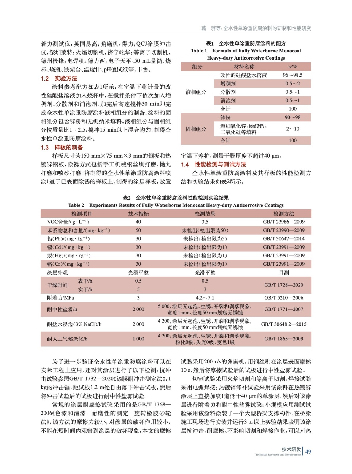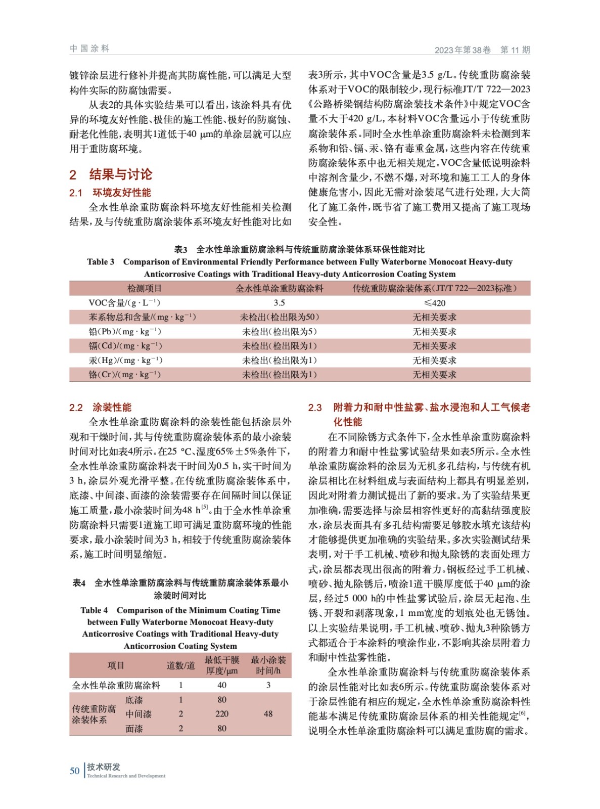 摘要:研究開發了一種全水性單涂重防腐涂料,其VOC含量為3.5 g/L,無苯系物和鉛、鎘、汞、鉻有毒重金屬;1道低于40 μm的單涂層耐中性鹽霧時間5 000 h,耐鹽水浸泡時間4 200 h,耐人工氣候老化時間4 200 h;不同表面除銹方式條件下,涂層都表現出優異的附著力和防腐性能;涂層耐摩擦、抗沖擊、機械性能優異;涂層不影響切割和焊接作業;涂料可以對熱鍍鋅涂層進行修補涂裝,并提高其防腐性能;制作的大型橋梁支撐構件,使用3 a涂層無生銹現象。