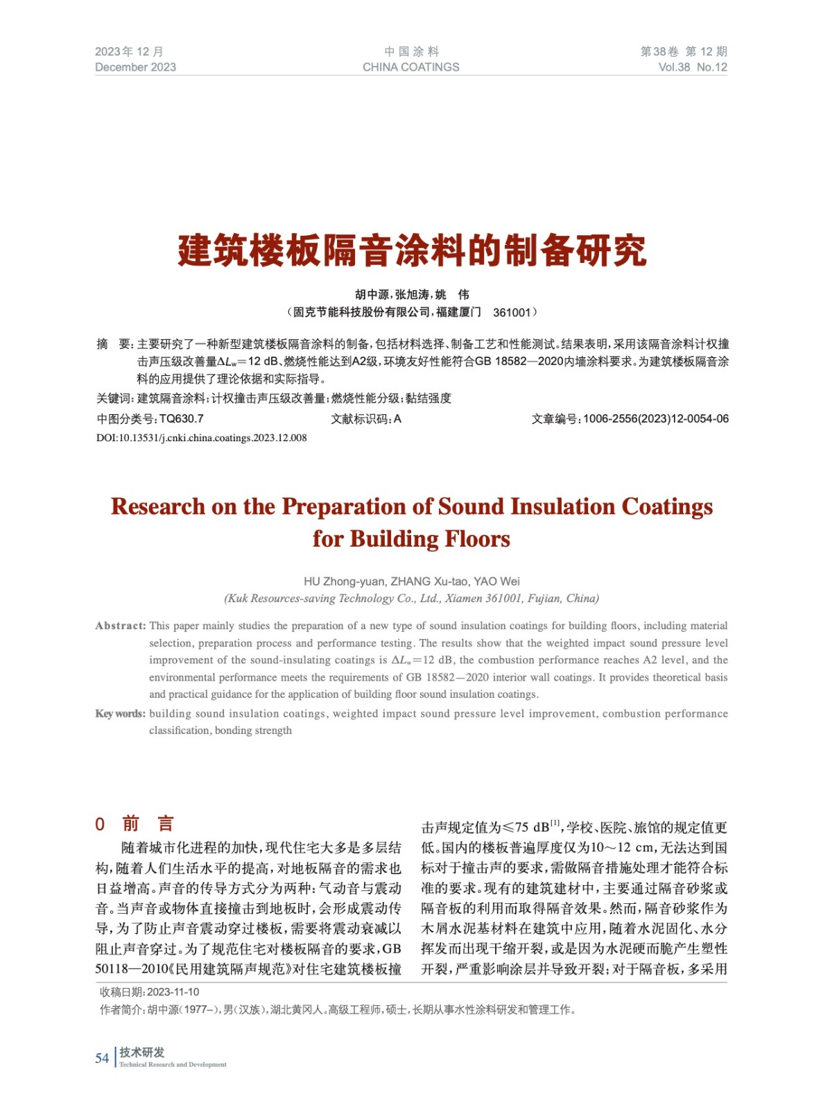 摘要:主要研究了一種新型建筑樓板隔音涂料的制備,包括材料選擇、制備工藝和性能測試。結(jié)果表明,采用該隔音涂料計(jì)權(quán)撞擊聲壓級改善量ΔLw=12 dB、燃燒性能達(dá)到A2級,環(huán)境友好性能符合GB 18582—2020內(nèi)墻涂料要求。為建筑樓板隔音涂料的應(yīng)用提供了理論依據(jù)和實(shí)際指導(dǎo)。