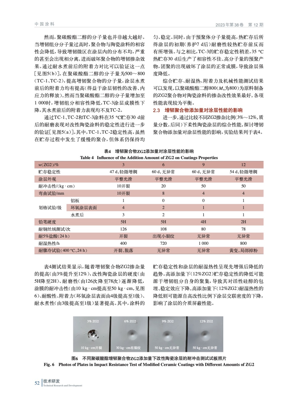 摘要:以聚碳酸酯二醇和γ–異氰酸酯基丙基三乙氧基硅烷為原料,制備了具有良好硅烷相容性與貯存穩(wěn)定性的活性增韌聚合物ZG2,并將其應(yīng)用于陶瓷涂料的柔性改性。實(shí)驗(yàn)結(jié)果顯示,聚碳酸酯基增韌聚合物ZG2的摻雜,一方面可以包埋涂料中的活性硅醇,延長涂料的貯存周期;另一方面可以充當(dāng)涂層中的柔性緩沖區(qū),改善因收縮應(yīng)力而產(chǎn)生的涂層開裂、附著力低等問題。此外,ZG2還可以參與陶瓷涂料的交聯(lián)進(jìn)程,提升涂層的腐蝕介質(zhì)屏蔽性。當(dāng)ZG2的摻雜質(zhì)量分?jǐn)?shù)為9%時(shí),所得改性雜化陶瓷涂料的貯存穩(wěn)定性、熱穩(wěn)定性、機(jī)械強(qiáng)度及綜合防護(hù)性能最優(yōu),具備市場化推廣潛力。