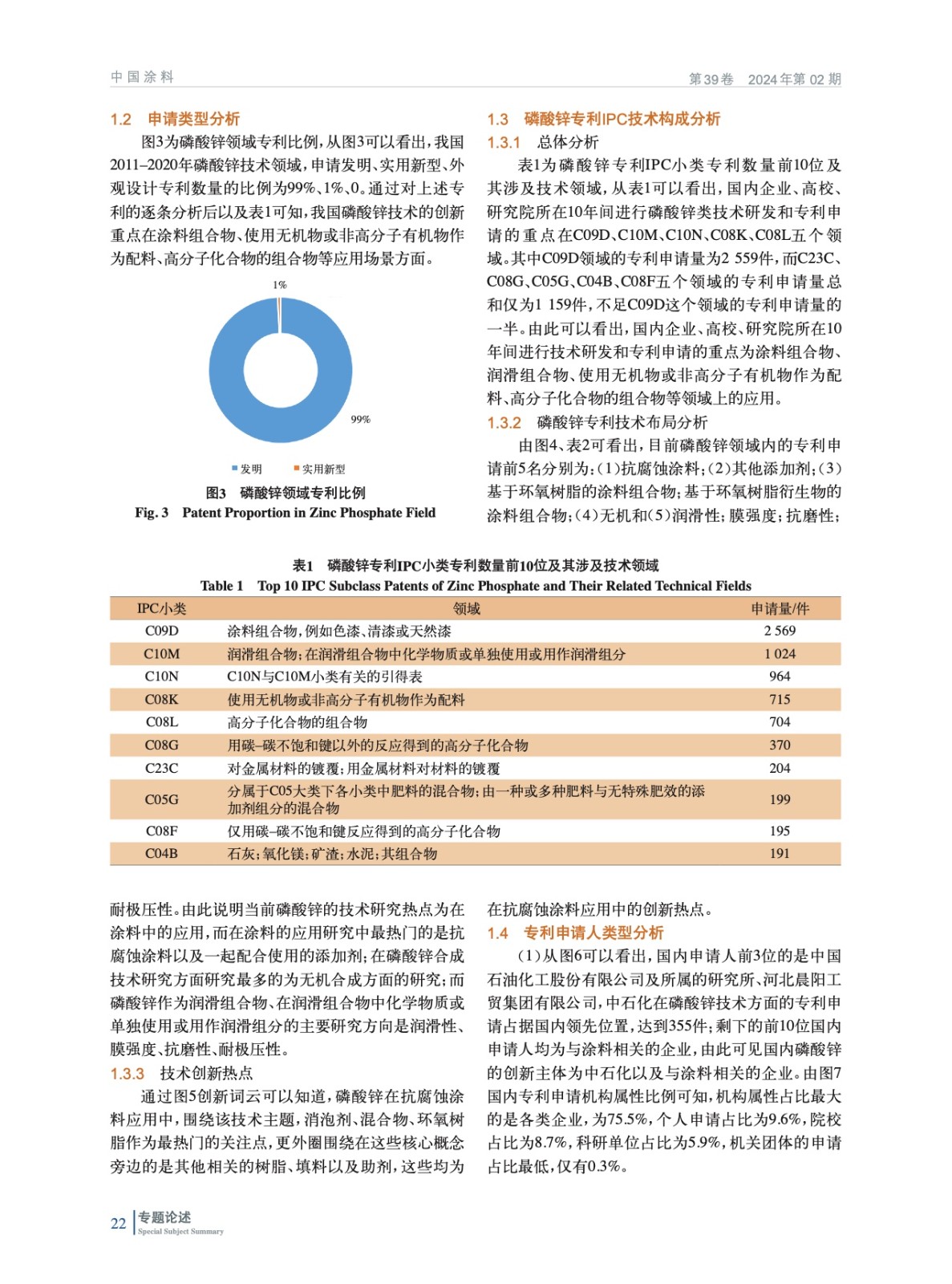 摘要:通過研究我國磷酸鋅申請專利保護的情況,對其自主創新和專利應用的特點進行了全面分析。分析表明,2011–2018年我國磷酸鋅專利申請量上升,2019–2022年開始下降,專利申請類型以發明專利為主,專利保護以磷酸鋅在涂料中的應用(其中主要是抗腐蝕涂料)為主。同時通過對磷酸鋅專利技術發展趨勢與競爭力預測的分析,以及對開發高端磷酸鋅產品的方式和現有專利的運營方式提出了建議。