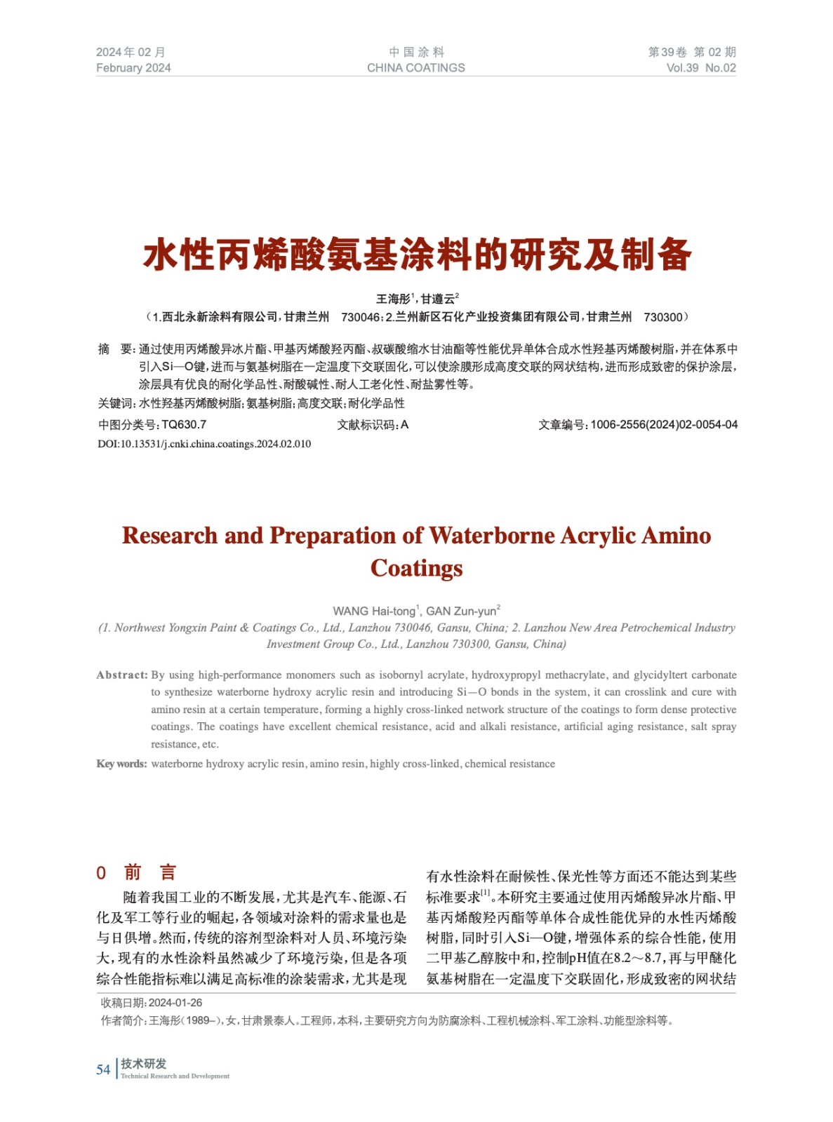 摘要:通過使用丙烯酸異冰片酯、甲基丙烯酸羥丙酯、叔碳酸縮水甘油酯等性能優異單體合成水性羥基丙烯酸樹脂,并在體系中引入Si—O鍵,進而與氨基樹脂在一定溫度下交聯固化,可以使涂膜形成高度交聯的網狀結構,進而形成致密的保護涂層,涂層具有優良的耐化學品性、耐酸堿性、耐人工老化性、耐鹽霧性等。