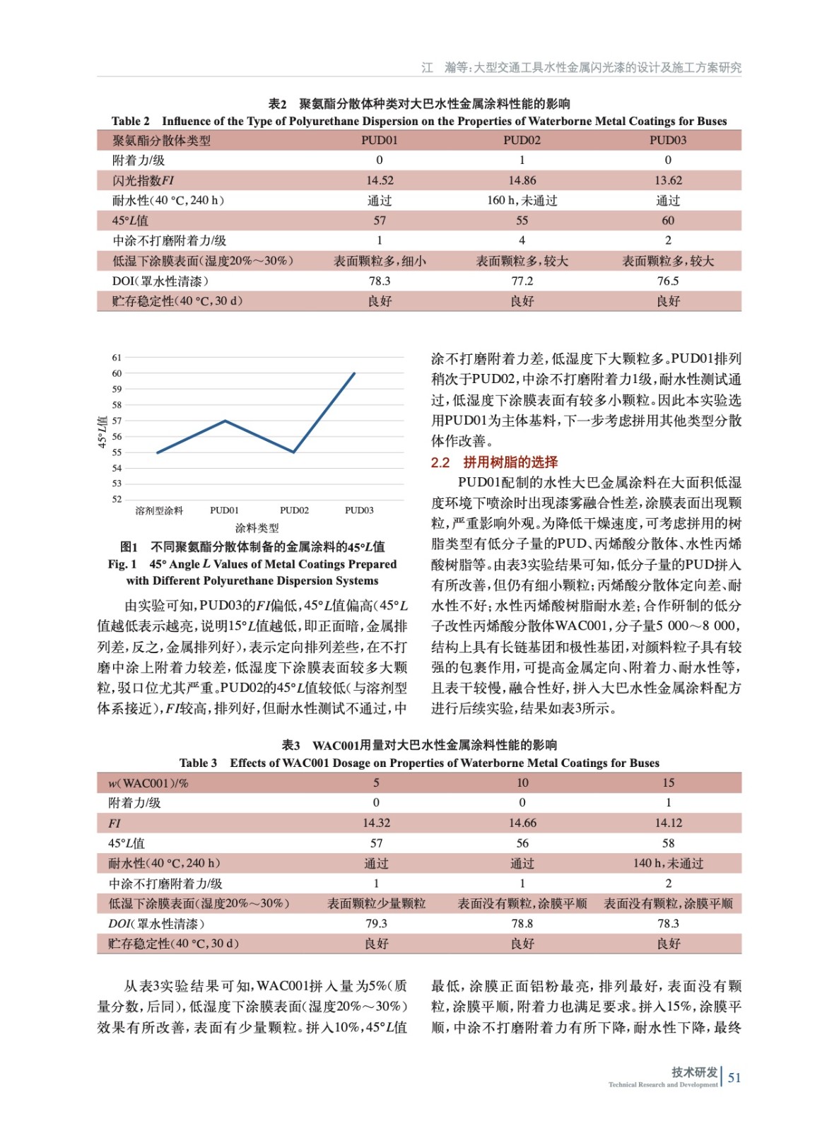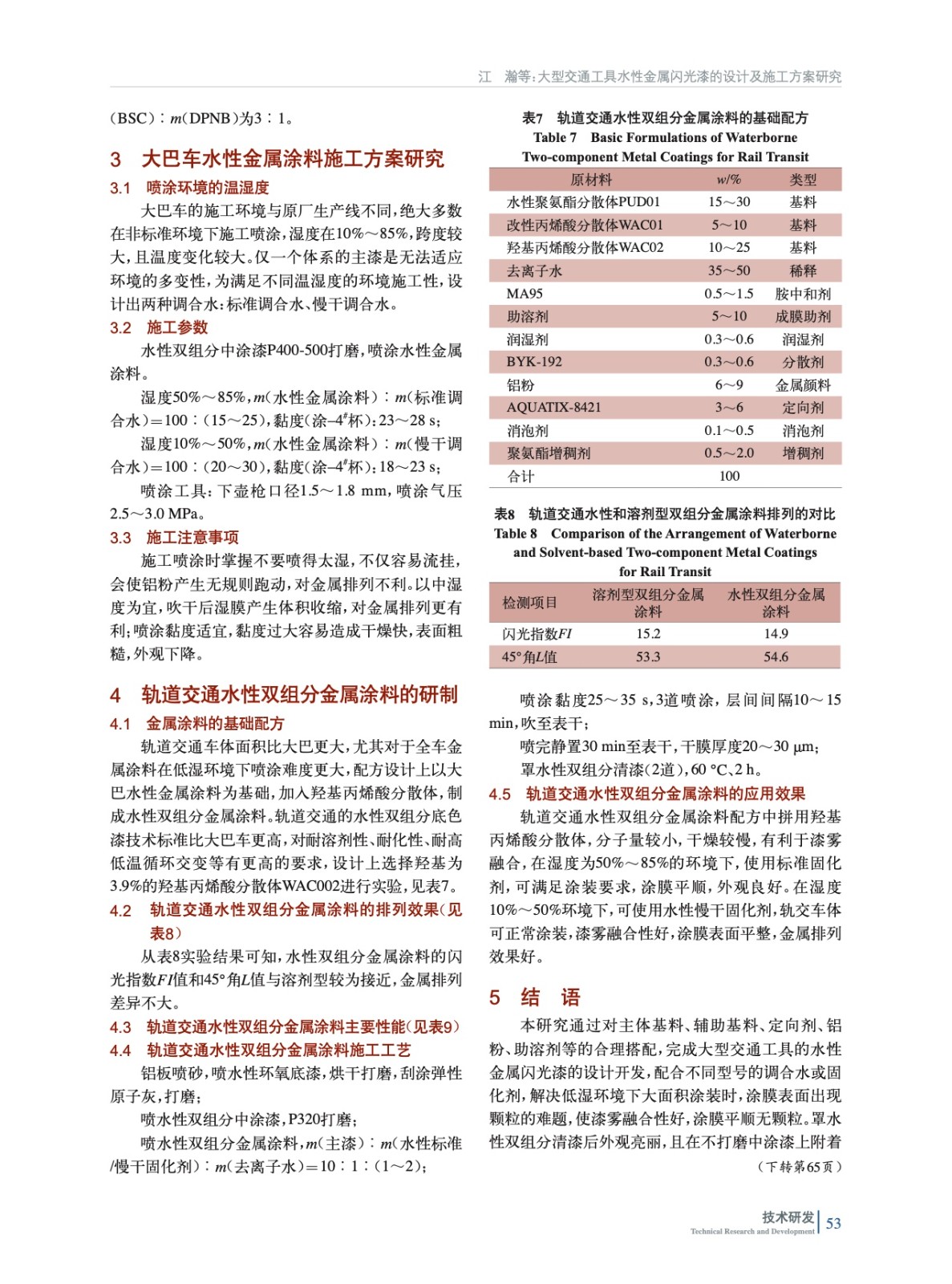 摘要:研究了大型交通工具的涂裝特點,設計大型交通工具水性金屬閃光漆的配方組成,通過主體基料、輔助基料、定向劑、鋁粉、助溶劑等的合理搭配,配合不同型號的調合水或固化劑,使水性金屬閃光漆施工性滿足要求,尤其是適應低濕環境下大面積涂裝,漆霧融合性好,涂膜平順,金屬定向排列好,整體外觀亮麗且各項性能符合主機廠的技術標準。