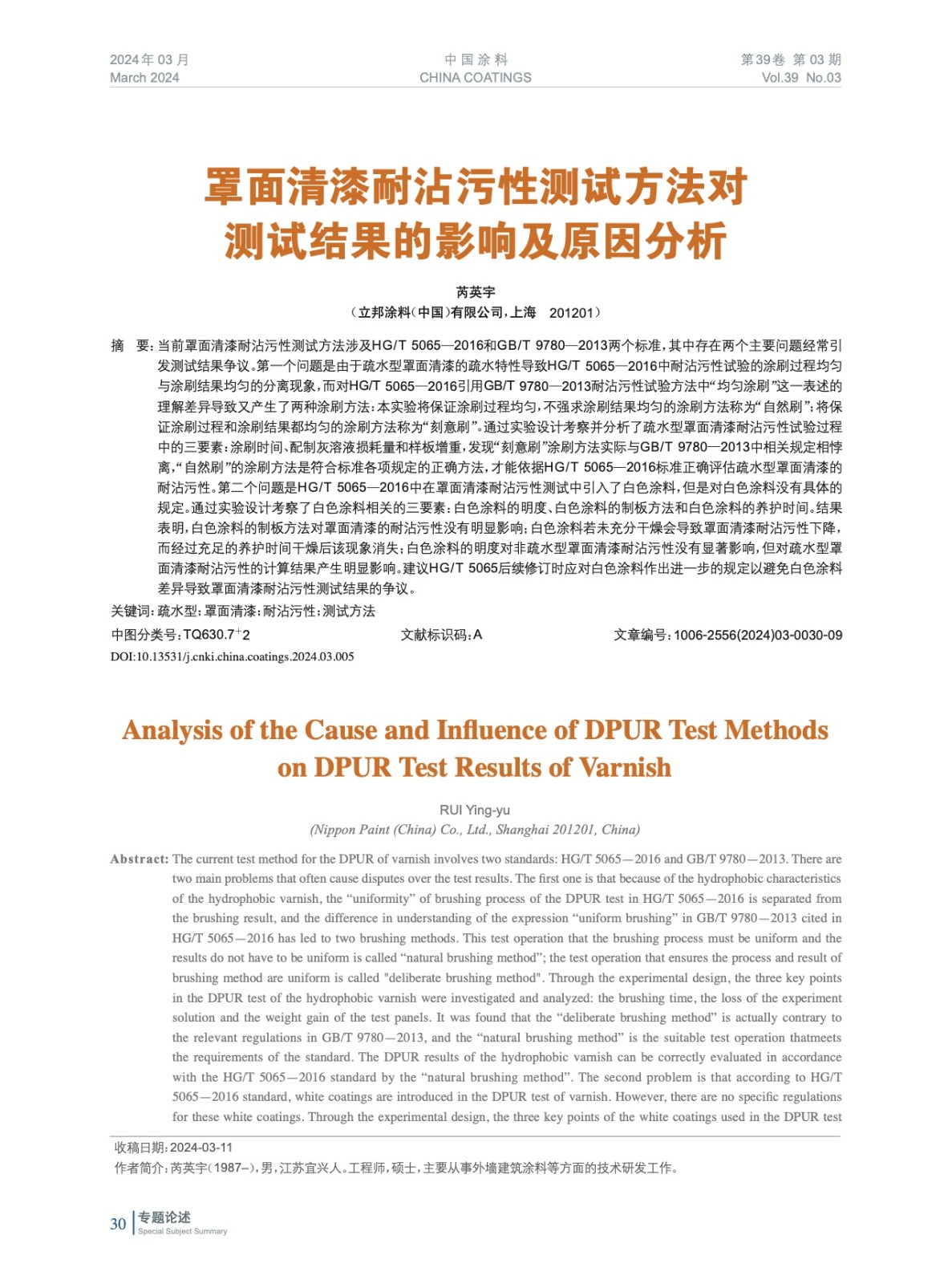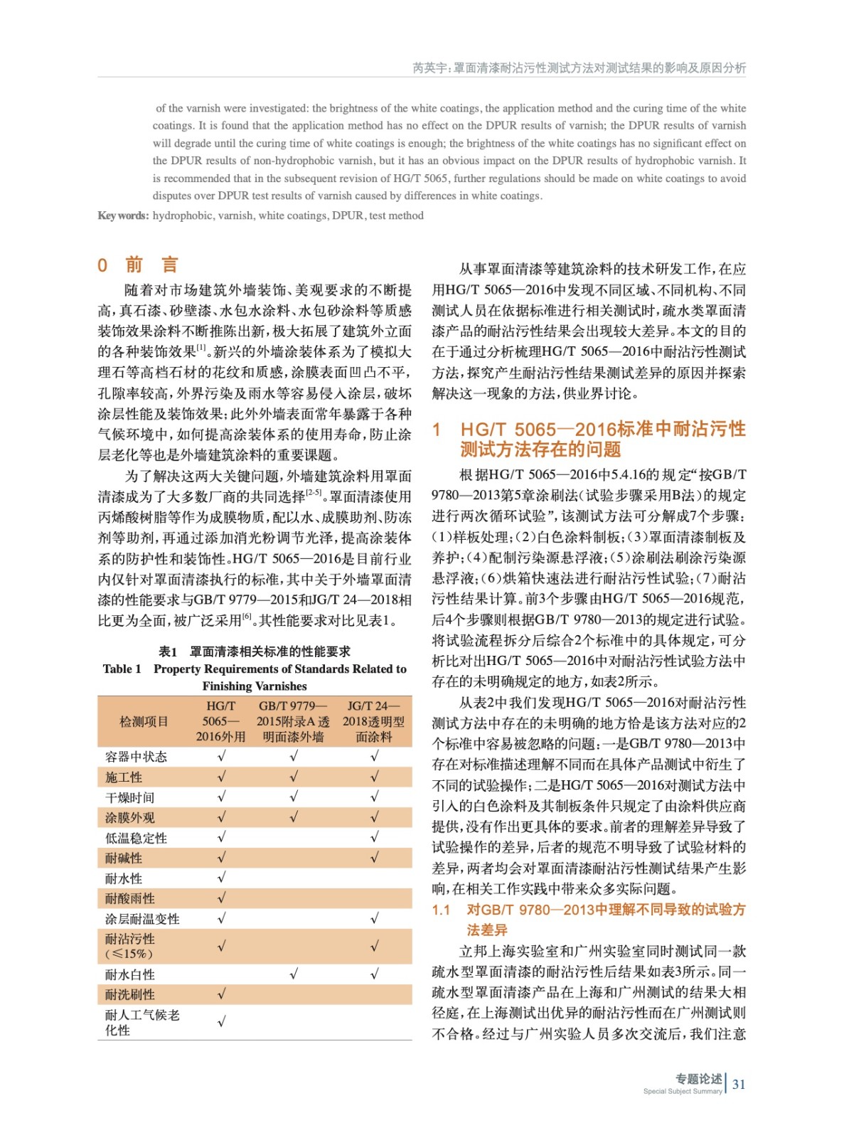 摘要:當(dāng)前罩面清漆耐沾污性測試方法涉及HG/T 5065—2016和GB/T 9780—2013兩個(gè)標(biāo)準(zhǔn),其中存在兩個(gè)主要問題經(jīng)常引發(fā)測試結(jié)果爭議。實(shí)驗(yàn)對(duì)兩個(gè)標(biāo)準(zhǔn)存在的問題及印發(fā)的爭議進(jìn)行了測試,并給出了解決方案。