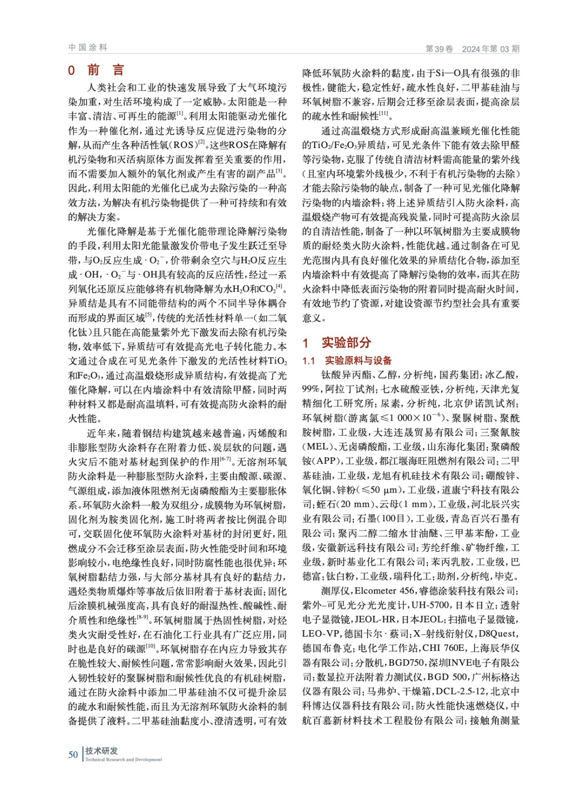 摘要:采用水熱法合成TiO2、Fe2O3的前聚體,并通過高溫煅燒制備了TiO2/Fe2O3異質(zhì)結(jié),通過XRD、SEM、TEM等一系列表征TiO2、Fe2O3的形成,紫外–漫反射光譜圖表明,TiO2/Fe2O3異質(zhì)結(jié)在可見光范圍內(nèi)吸光性能較TiO2和Fe2O3明顯紅移。通過Tauc曲線、Mott-Schottky曲線理論計(jì)算得出TiO2/Fe2O3異質(zhì)結(jié)的形成,該異質(zhì)結(jié)對(duì)甲基橙的180 min催化率為94%,可見光范圍內(nèi)表現(xiàn)出卓越的光催化活性。在內(nèi)墻涂料中添加質(zhì)量比為1∶100時(shí)對(duì)甲醛24 h 光催化降解效率為89.6%,TiO2/Fe2O3異質(zhì)結(jié)在高溫煅燒下形成一種優(yōu)良的耐高溫填料,因此在防火涂料中的應(yīng)用顯著增強(qiáng)了其阻燃抑煙性能。在防火涂料中的添加質(zhì)量比為2.5∶100時(shí),防火涂料的殘?zhí)苛繌?5%提升至39%,環(huán)氧防火涂料9.0 mm耐火230 min,呈現(xiàn)出良好的防火性能,環(huán)氧涂層黏結(jié)力強(qiáng),耐久性、機(jī)械性好,膨脹炭層強(qiáng)度高、致密性好,TiO2/Fe2O3異質(zhì)結(jié)存在還使該防火涂料具有良好的自清潔性能。