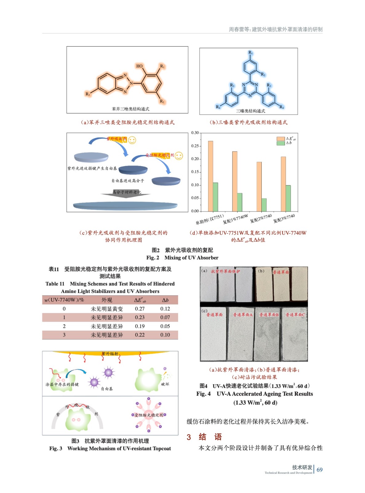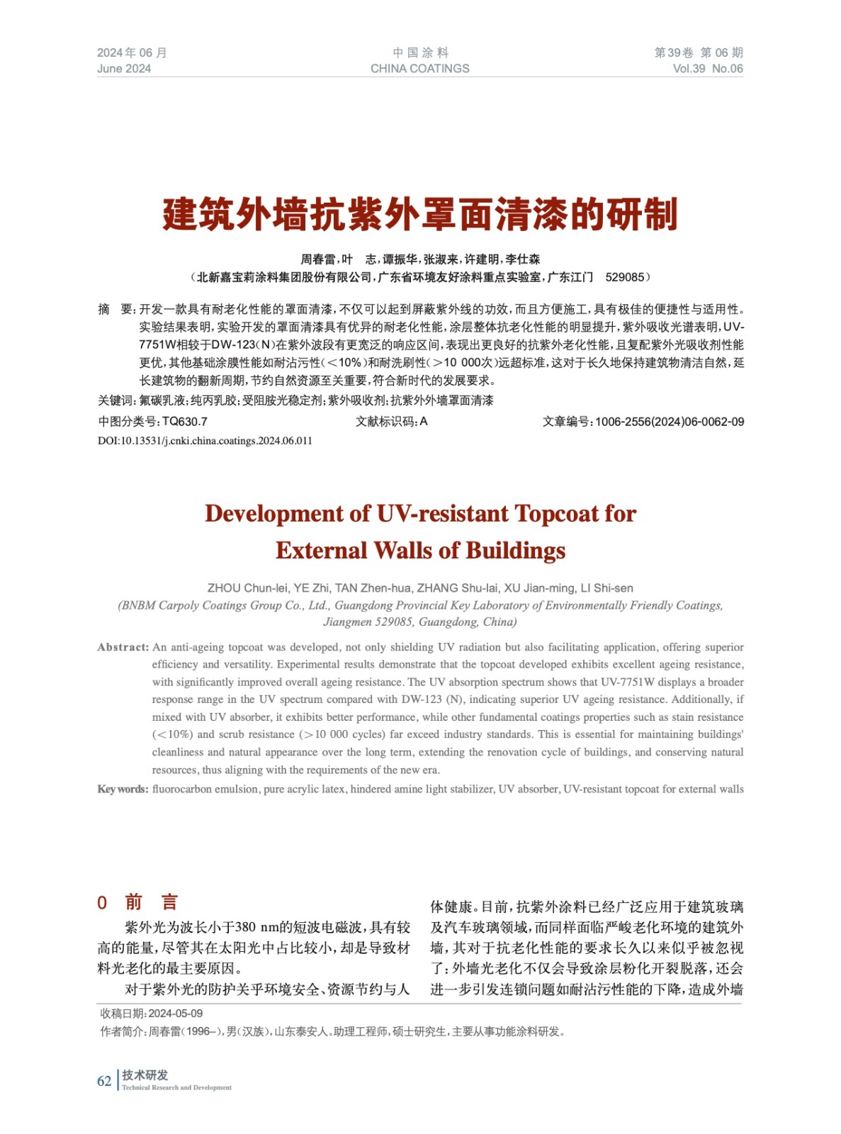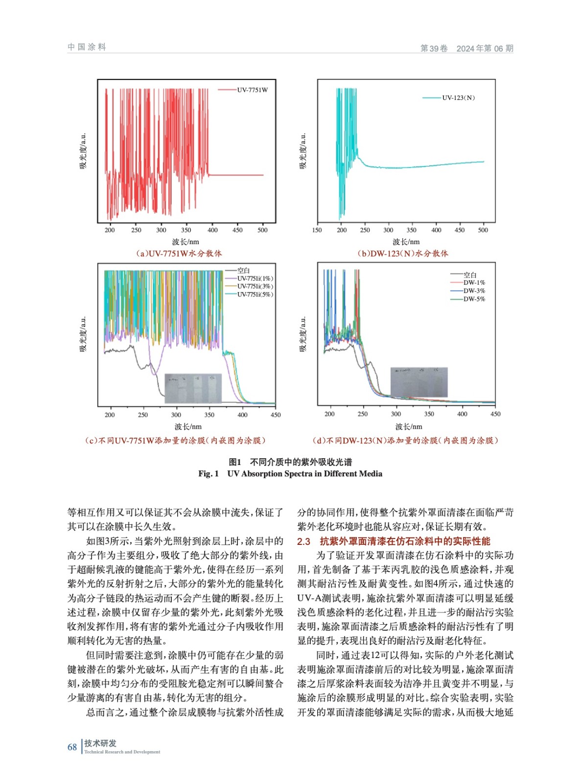 摘要:開發一款具有耐老化性能的罩面清漆,不僅可以起到屏蔽紫外線的功效,而且方便施工,具有極佳的便捷性與適用性。實驗結果表明,實驗開發的罩面清漆具有優異的耐老化性能,涂層整體抗老化性能的明顯提升,紫外吸收光譜表明,UV-7751W相較于DW-123(N)在紫外波段有更寬泛的響應區間,表現出更良好的抗紫外老化性能,且復配紫外光吸收劑性能更優,其他基礎涂膜性能如耐沾污性(<10%)和耐洗刷性(>10 000次)遠超標準,這對于長久地保持建筑物清潔自然,延長建筑物的翻新周期,節約自然資源至關重要,符合新時代的發展要求。