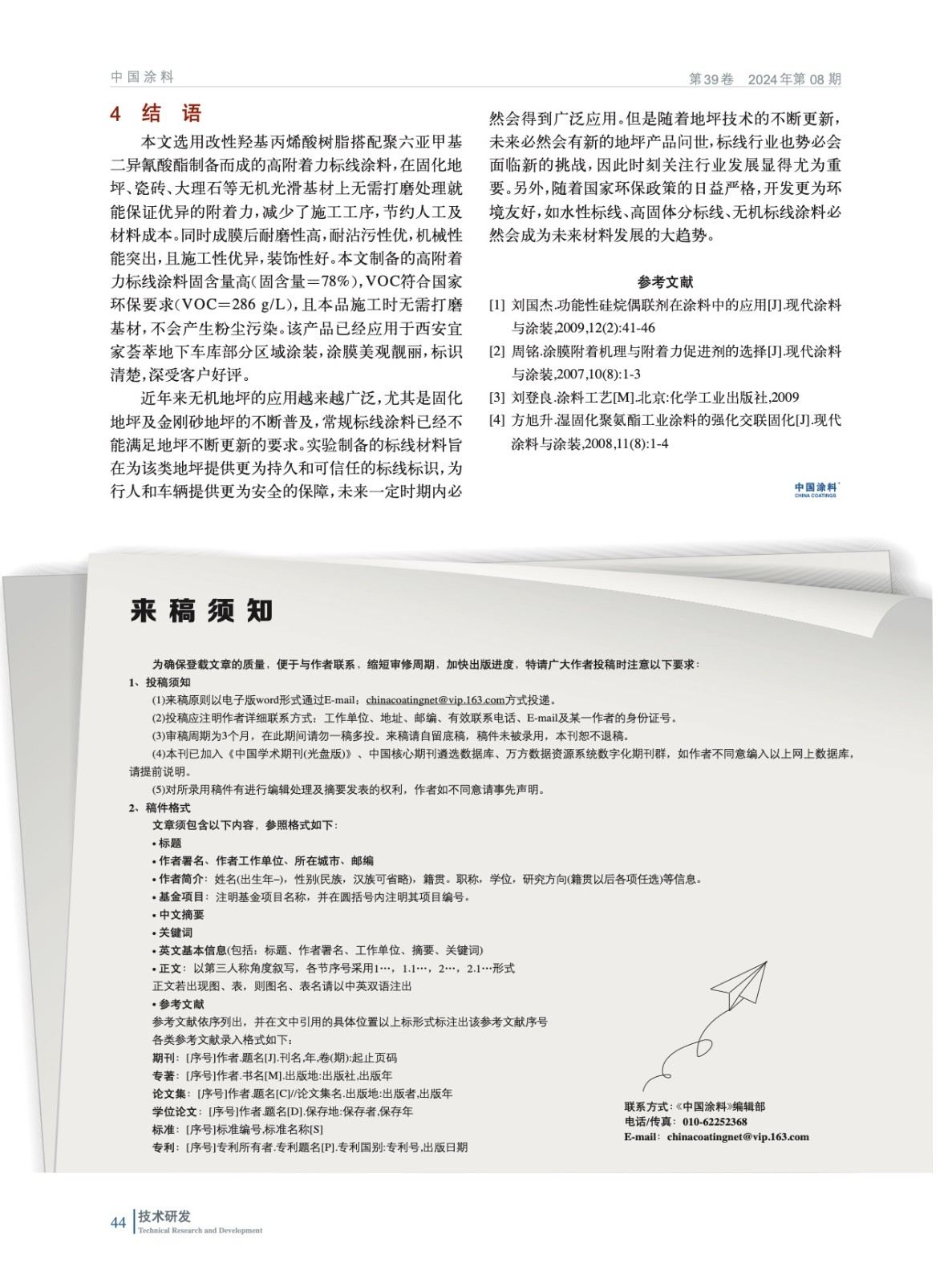 摘要:以改性羥基丙烯酸樹脂和聚六亞甲基二異氰酸酯固化劑為成膜物質,通過調整固化劑配比,改善涂膜機械性能和耐化學品性,優選附著力促進劑,制備一種在固化地坪、金剛砂地坪、瓷磚、玻璃等未經打磨的光滑基材上有優異附著力的標線涂料,該標線涂料綜合聚氨基甲酸酯、聚脲的優點,可廣泛用于上述基材的標線標識涂裝,具有極高的經濟效益。