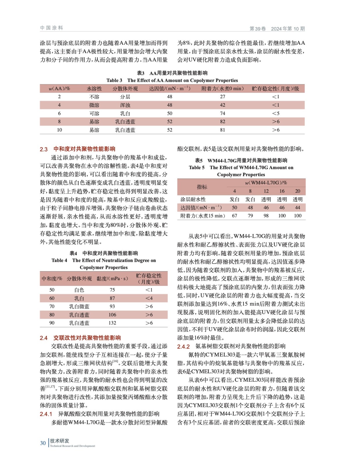 摘要:采用溶液聚合制備了一款預涂膜用聚丙烯酸酯水分散體,將其涂覆在聚酯薄膜表面得到預涂膜。研究了引發劑過氧化苯甲酰(BPO)用量、丙烯酸(AA)用量、中和度、不同交聯劑改性以及交聯溫度對聚丙烯酸酯水分散體性能的影響。結果表明:BPO用量為1.4%(質量分數,后同),AA用量8%,中和度80%,交聯劑WM44-L70G用量16%,交聯反應條件為130 ℃、5 min時,UV硬化涂層在預涂膜上的附著力最佳。