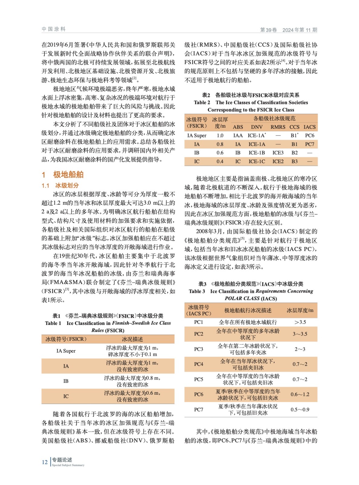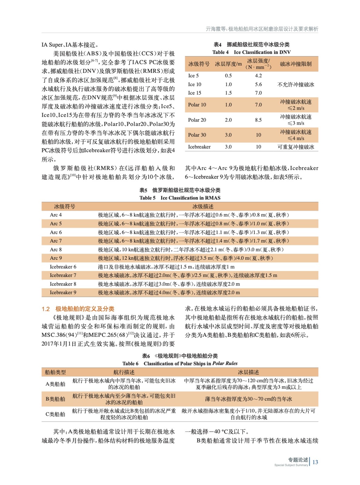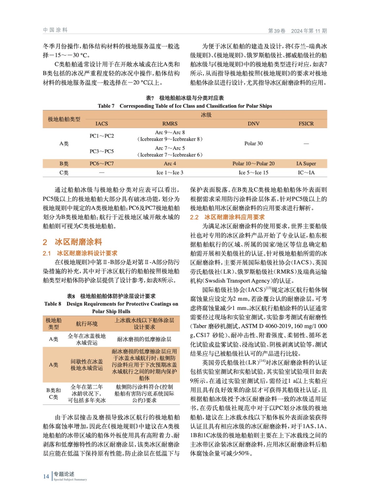 分析了不同船級社及團體對于冰區船舶的冰級分類,并通過冰級確定極地船舶的分類,從而確定冰區耐磨涂料在極地船舶上的應用需求。總結各船級社對于冰區耐磨涂料的應用要求,并調研國內外相關產品,為我國冰區耐磨涂料的國產化發展提供指導。