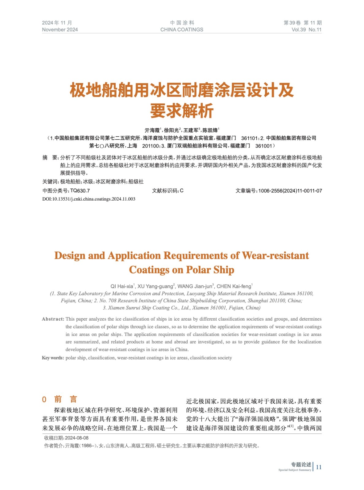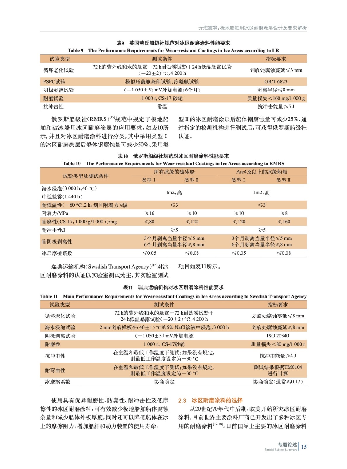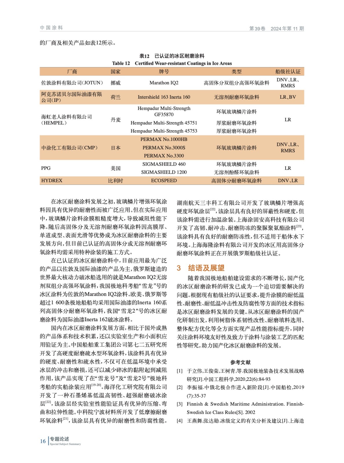 分析了不同船級社及團體對于冰區船舶的冰級分類,并通過冰級確定極地船舶的分類,從而確定冰區耐磨涂料在極地船舶上的應用需求。總結各船級社對于冰區耐磨涂料的應用要求,并調研國內外相關產品,為我國冰區耐磨涂料的國產化發展提供指導。