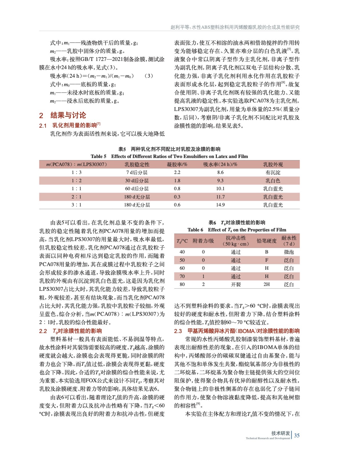摘要:以甲基丙烯酸甲酯、丙烯酸正丁酯、苯乙烯為共聚單體,甲基丙烯酸異冰片酯(IBOMA)、N–丁氧基甲基丙烯酰胺(NBMA)、烯丙基聚硅氧烷(UAX806)為功能單體;聯(lián)用過硫酸鹽和氧化–還原為引發(fā)體系,通過種子乳液聚合制得乳膠,再與色漿配制成塑料基材用漆。考察了陰/非乳化劑配比、玻璃化轉(zhuǎn)變溫度(Tg)、甲基丙烯酸異冰片酯、N–丁氧基甲基丙烯酰胺以及烯丙基聚硅氧烷等因素對塑料涂料綜合性能的影響。當(dāng)乳化劑m(PCA078)︰m(LPS30307)為2︰1、IBOMA用量為12%(質(zhì)量分?jǐn)?shù),后同)、NBMA用量為2%、AX806為1%時得到的乳膠綜合性能最優(yōu)。