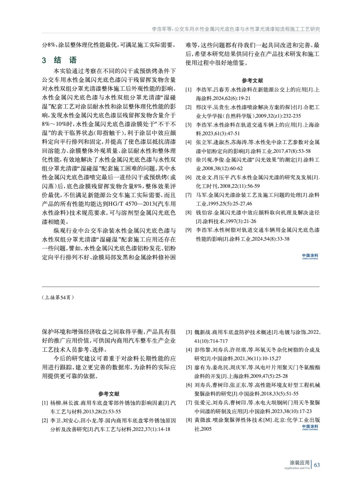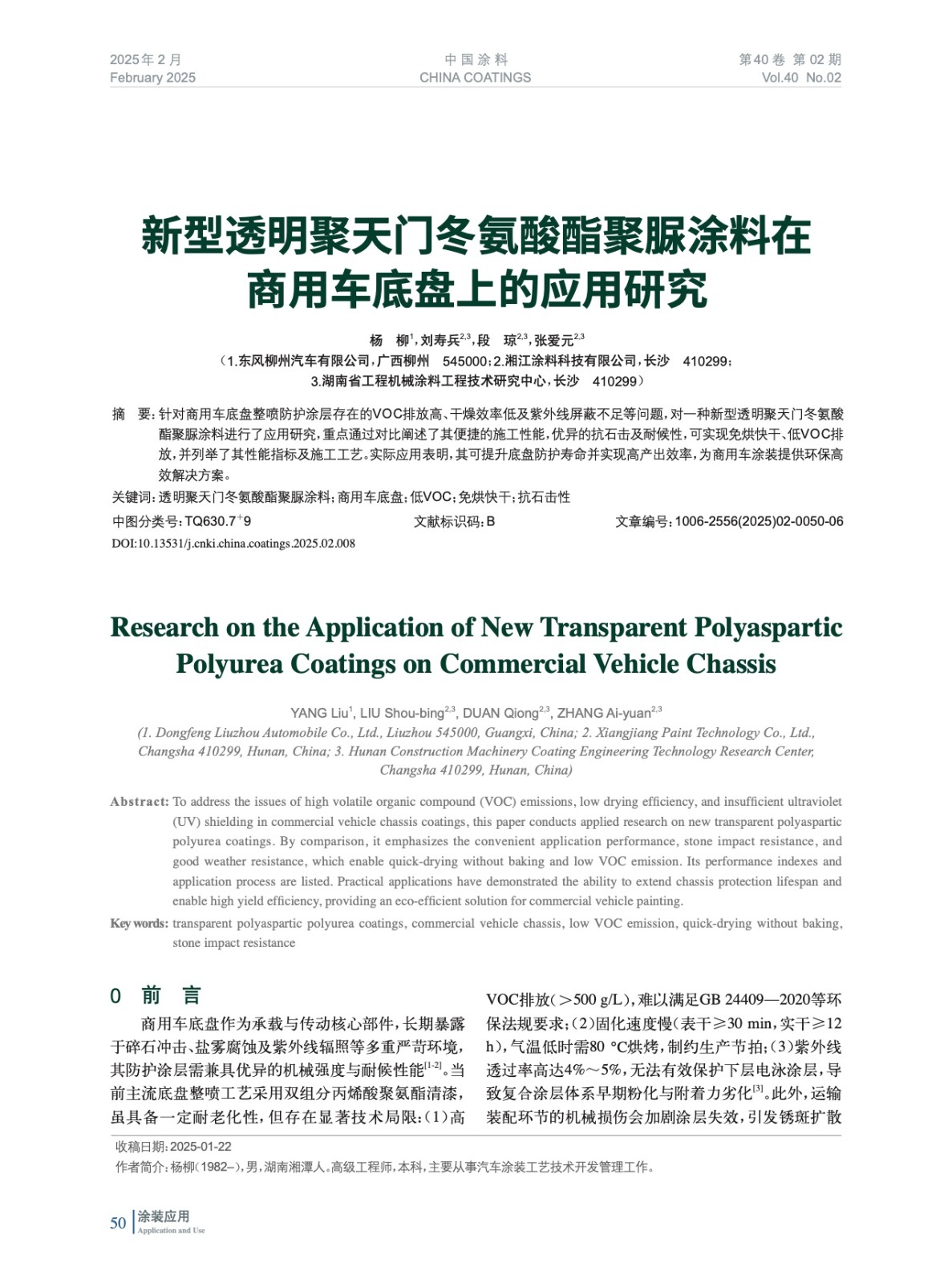 摘要:針對商用車底盤整噴防護涂層存在的VOC排放高、干燥效率低及紫外線屏蔽不足等問題,對一種新型透明聚天門冬氨酸酯聚脲涂料進行了應用研究,重點通過對比闡述了其便捷的施工性能,優異的抗石擊及耐候性,可實現免烘快干、低VOC排放,并列舉了其性能指標及施工工藝。實際應用表明,其可提升底盤防護壽命并實現高產出效率,為商用車涂裝提供環保高效解決方案。